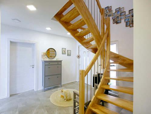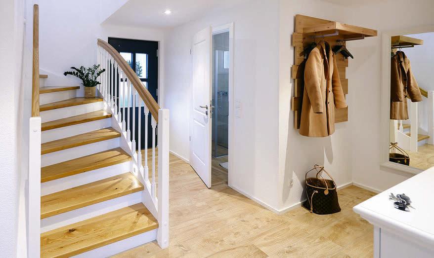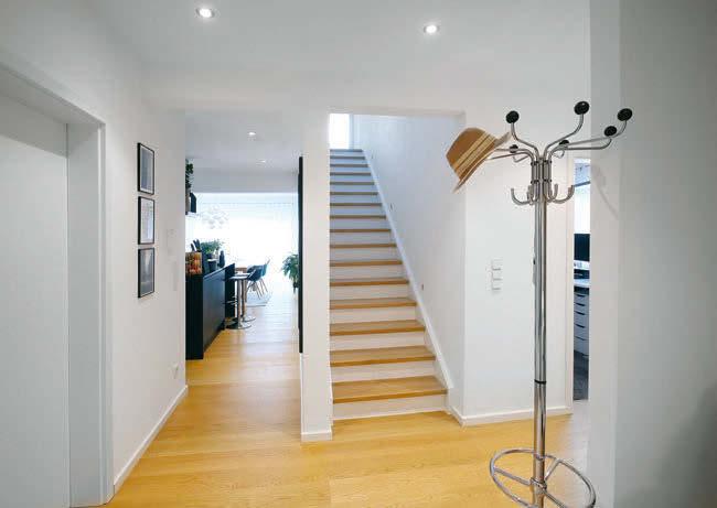 Bauherr Sebastian Wittek ist Architekt. Aber sein eigenes Einfamilienhaus überließ er einem Fertighaushersteller. „Ich muss nicht zwingend meinen Namen unter mein Eigenheim setzen“, schmunzelt er. Natürlich schummelten er und seine Frau Melissa trotzdem ihre eigenen Vorstellungen in das Fertighaus. Ein zweites Badezimmer im Obergeschoss musste sein, die Bauherrin freut sich über ihren begehbaren Kleiderschrank und der Bauherr ist immer noch begeistert über den Tageslichtspot in der Decke, dank dem Licht in das Treppenhaus fällt. Die größte Änderung war der Kniestock: 1,70 Meter misst er nun. Dadurch wurde das Haus höher, als der Bebauungsplan vorgab. „Wenn ich nicht höher bauen darf, baue ich eben tiefer“, beschloss der Bauherr kurzerhand. Jetzt steht das Haus knapp einen Meter unter Straßenhöhe.