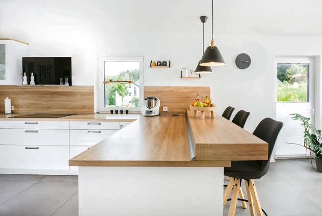 Beim Abwasch können die Bauherren direkt in ihren Garten schauen. Die Esstheke und die offen gestaltete Küche machen das Kochen gesellig.