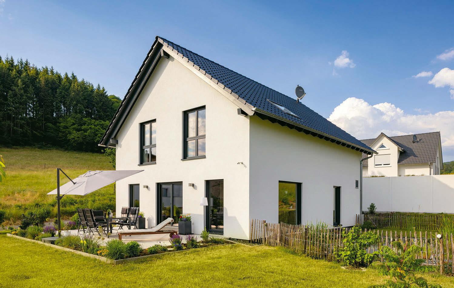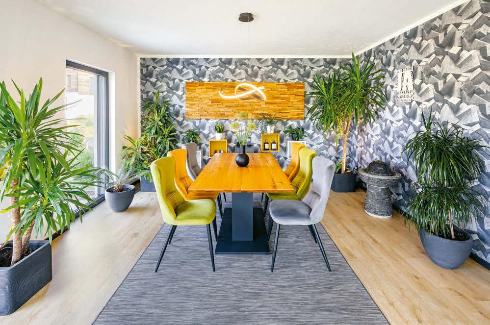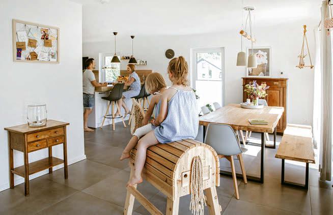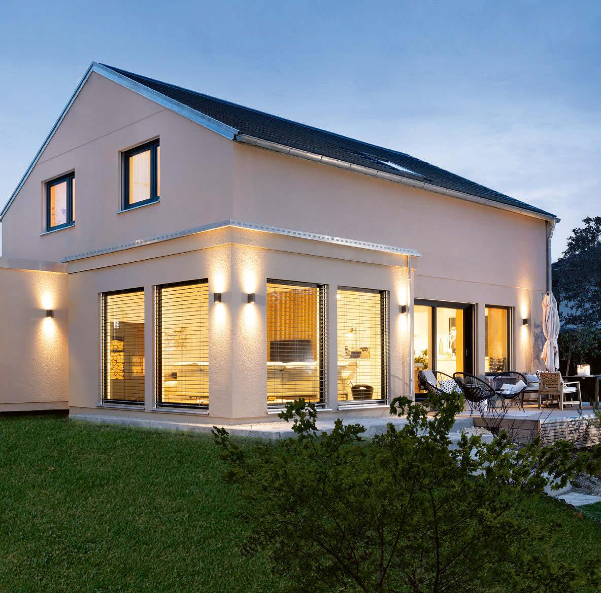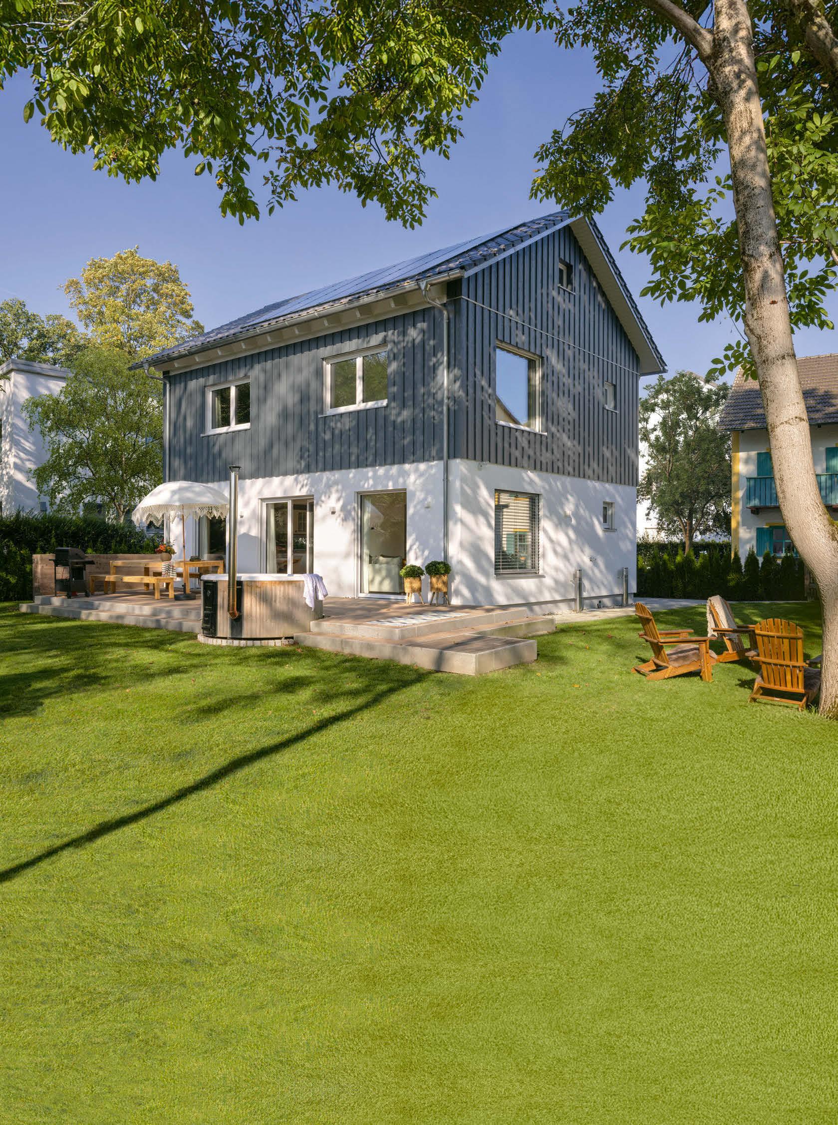 Richtung Straße. Auch hierfür haben die Bauherren eine Erklärung: Abends sitzen sie gemütlich auf dem Sofa vor dem Fernseher. Wofür die Aussicht in den Garten verschwenden, wenn sie eh die Rollläden schließen wollen? Außerdem merken sie von der Straße nicht viel – dafür sorgen die Hecke und die Lage: „Wir wohnen sehr, sehr ländlich. Gefühlt kommt hier einmal am Tag ein Bus und dreimal ein Auto vorbei.“ Den Blick ins Grüne heben sie sich für Küche und Esszimmer auf. Die Bauherrin kocht leidenschaftlich gerne, am Esstisch verbringen sie viel Zeit mit Freunden und Verwandten. Noch ein Bonus: Vom Essbereich geht es direkt auf die überdachte Terrasse. Hier wird gegrillt, gegessen und abends im atmosphärisch beleuchteten Garten entspannt.