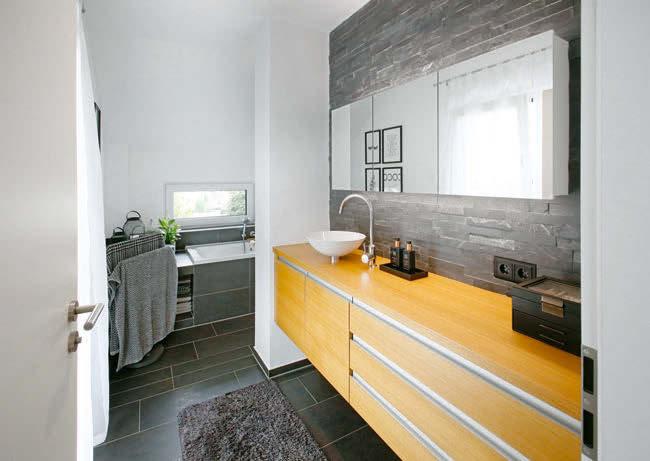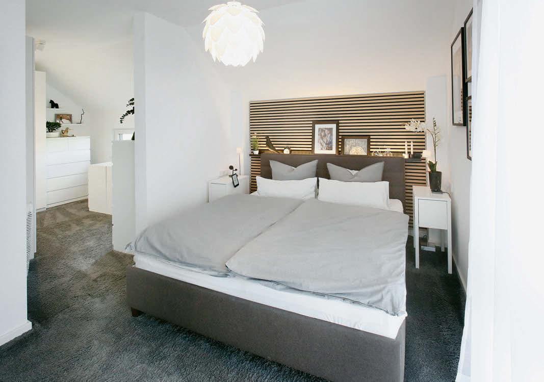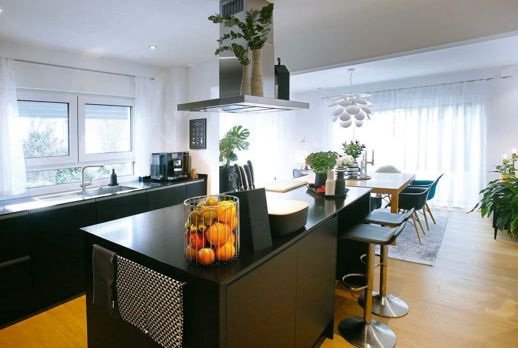 Lieblingshaus „Einen Lieblingsraum habe ich nicht, weil es ja mein Lieblingshaus ist“, sagt Sebastian Wittek. Der Bauherrin war die offene, schwarze Küche mit Kochinsel wichtig: „Wenn wir Besuch haben, bin ich zum Kochen nicht außen vor in einem Extra-Raum, sondern mitten dabei.“ Den Bauherrn freut, dass auch die praktischen Räume im Haus schön sind. „Luxus bedeutet für uns nicht goldene Wasserhähne. Luxus kann einfach ein funktionierender Alltag sein.“ Dass der reibungslos läuft, wurde Ende letzten Jahres umso wichtiger: Baby Leon zog ein. Der Yogaraum wich dem Kinderzimmer. Einen Hobbyraum gibt es trotzdem: Hier kommt die Gitarrensammlung des Bauherrn unter. Der einzige Wermutstropfen im Grundriss? Der Technikraum könnte größer sein. „Das ist wirklich jammern auf höchstem Niveau“, betont der Bauherr mindestens dreimal. „Aber