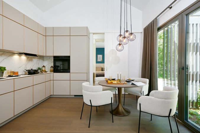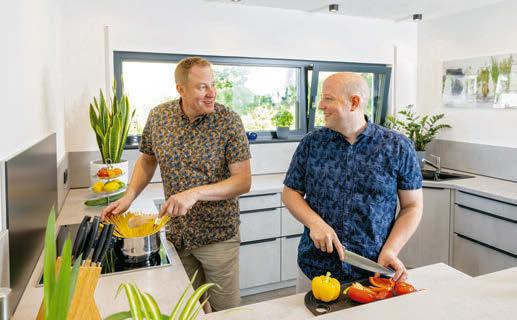Der schlimmste Bauherr Auch Bauherrin Melissa sammelt als Immobilienkauffrau täglich Hausbau-Inspiration. Sie und ihr Mann haben starke Meinungen. Zum Glück meistens dieselben. „Als es um die Fassade ging, hat es aber schon lange gedauert“, lacht sie. Die Fenster mussten perfekt übereinanderliegen. Das Dach durfte nicht überstehen. Die cleane Optik war einer der Hauptgründe, warum sich das Paar für das Hausmodell entschied. Der andere Grund war ihre Beraterin, der der Bauherr unbedingt ein kleines Danke widmen möchte: „Wir schätzen uns wirklich glücklich, dass wir in Sandra Pereira eine so tolle Beraterin hatten.“ Während der Bauphase waren es dann Bauleiter und Bauarbeiter, die unter dem genauen Auge des Bauherrn litten, wie er selbst schmunzelnd erzählt. „Architekten sind eben die schlimmsten Bauherren.“ Immer wieder warf er Korrekturen ein, achtete darauf, dass seine Wünsche umgesetzt wurden. Mangelfrei ist ein Bau eben nie, weiß der Bauherr und zitiert die alte Architektenweisheit: „Wenn es keinen Mangel gibt, habe ich nur nicht richtig hingeguckt.“