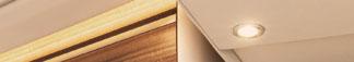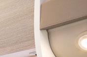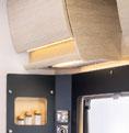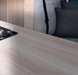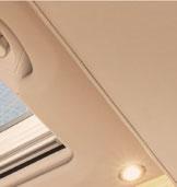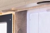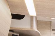 Kleiderstange rechts, sowie ein Wäscheschrank mit Klappe und Fachboden links, sind unter den Einzelbetten positioniert, beide leider unbeleuchtet. Sieben Oberschränke mit Fachböden, offene Ablagen und der Platz in den Schubladen des Küchenblocks sorgen für ausreichend Stauraum im Wohnraum. Ein dickes Plus gibt es für die Verarbeitungsqualität der Möbel. Da hat man bei Ahorn kräftig zugelegt, denn im Gegensatz zu früheren Fahrzeugen zeigt sich der Möbelbau und das gesamte Interieur auch auf weniger gut ausgebauten Straßen fast geräuschlos ohne Knarren und Klappern. Grund dafür sind die sauber und passgenau verarbeiteten Möbel mit exakt montierten MetallBeschlägen, eine solide und praxisgerechte Sitzgruppe, sowie die stabilen Auszüge mit Soft-Close an den Schubladen, die zudem über eine praktische ZentralverrieRückenlehnen der Polster mit Clips statt Klettbändern. Überzeugen kann ebenfalls das Beleuchtungskonzept: Von der zartblauen Bodenbeleuchtung über dezente Hintergrundbeleuchtung mittels LEDBändern bis hin zur wirksamen Direktbeleuchtung und diversen Lesespots reicht das Angebot des einwandfrei funktionierenden Lichtkonzeptes.