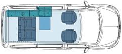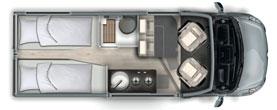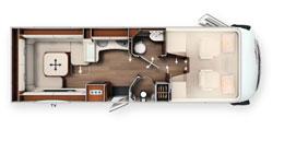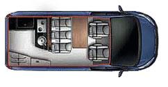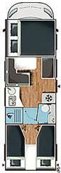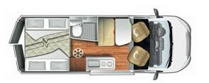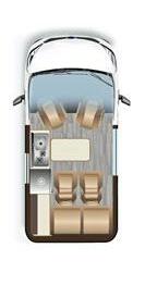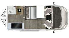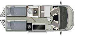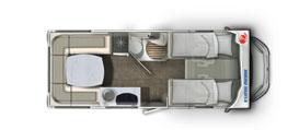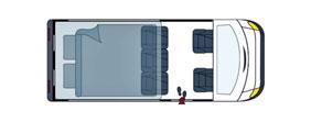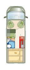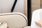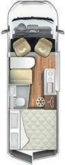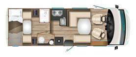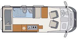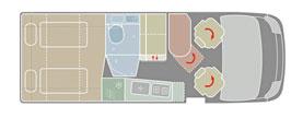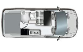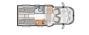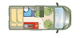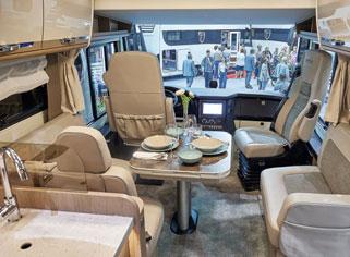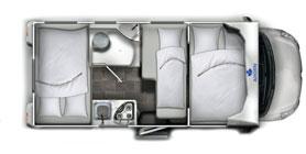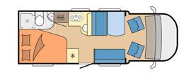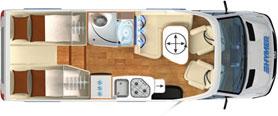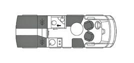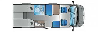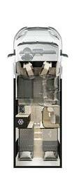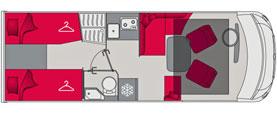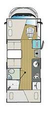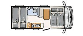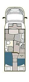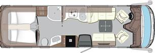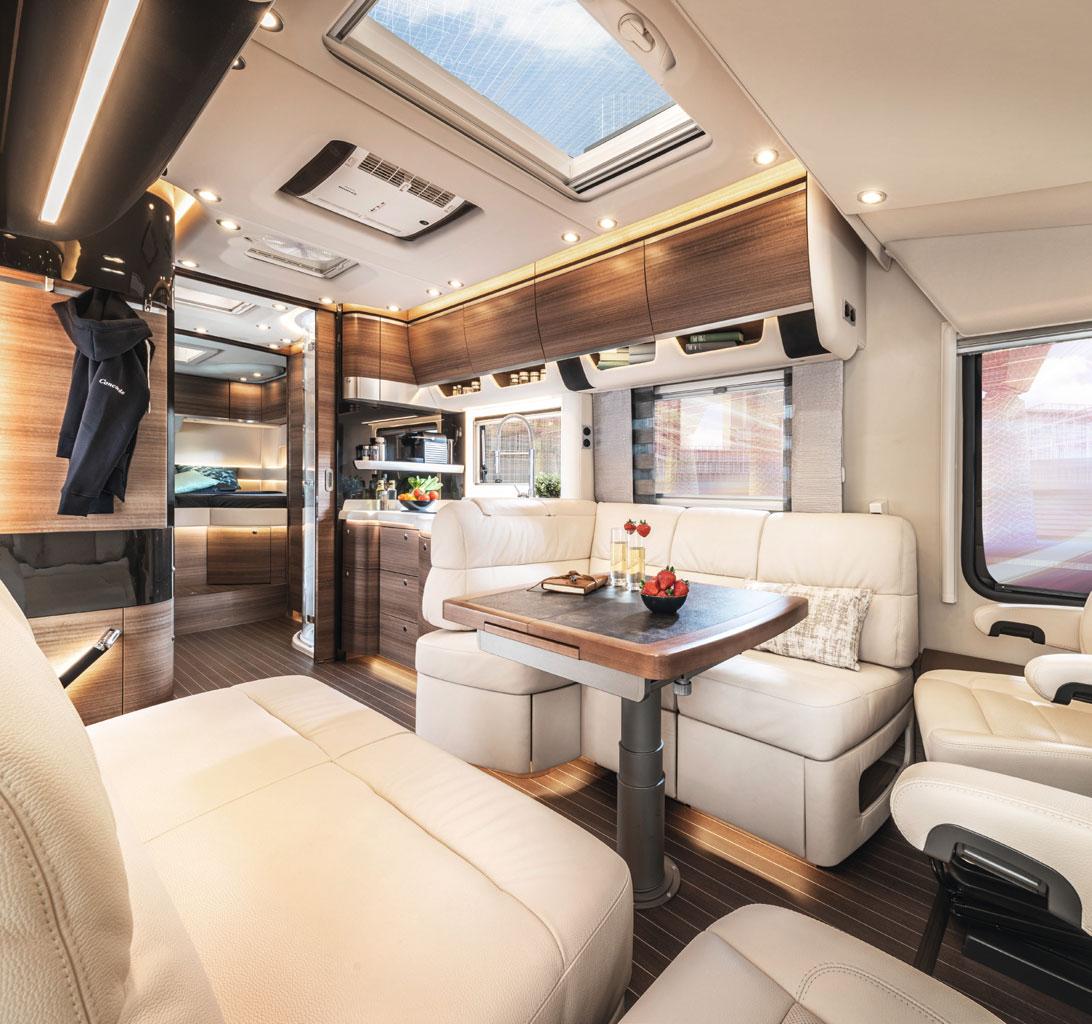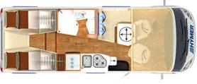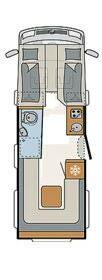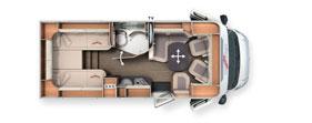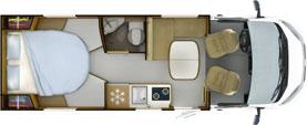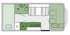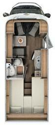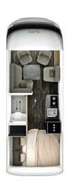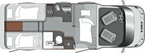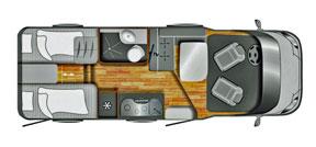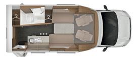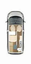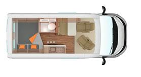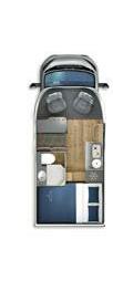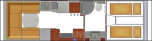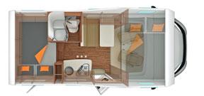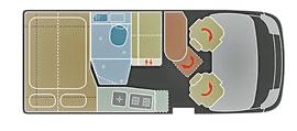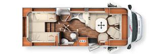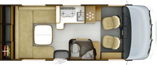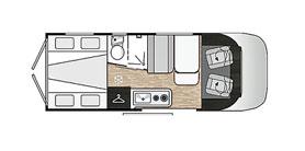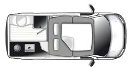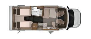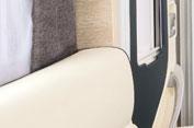 die F-Sitzgruppe, die freie Blickachsen in alle Richtungen ermöglicht, vermitteln ein freundliches Gefühl. Der Grundriss des Einzelbettenfahrzeugs ist geschickt in zwei Lebensbereiche geteilt. Eine massive Tür schließt den Wohnraum vom Sani-