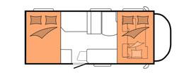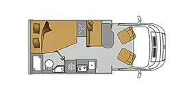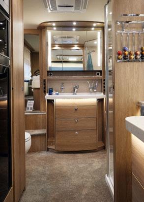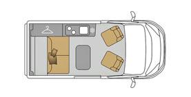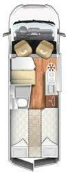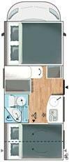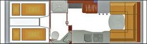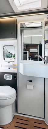 tär- und Schlafbereich ab. Die Sitzgruppe besteht aus zwei Längssofas, dem freistehenden Tisch mit einem stabilen Rohrfuß und den drehbaren Fahrerhaussitzen. Daran schließt sich auf der Fahrerseite die Küchenzeile mit gegenüber positioniertem und hochgesetztem Kühlschrank an. Ein echtes Multitalent ist der Tisch in der Sitzgruppe: Groß, stark und variabel kann er in alle Richtungen gedreht und geschoben werden, ist absenkbar und kann bis auf die Hälfte eingeklappt werden, eine gute und praktische Lösung. Kleines Manko an den Fahrerhaussitzen: Sie haben jeweils nur eine Armlehne, beim Fahren kein großes Problem, in Ruheposition aber gibt´s Sitzkomfort nur für Einarmige. Richtung Heck liegt direkt hinter der massiven Tür der Nassbereich. Dort ist rechts der separate Duschraum und links der Wasch- und Toilettenraum positioniert. Der durchgängig ebene Boden und die großzügigen Fensterder Eingangstür unterstützen den hellen und wohnlichen Gesamteindruck. Der Heckbereich über der Garage wird von den beiden kommoden Einzelbetten dominiert, die mit einem ausziehbaren Lattenrost zum komfortablen Doppelbett erweitert werden können. Ein Kleiderschrank mit Klappe und