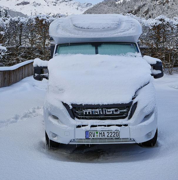 Nach einer Woche muss der Malibu wieder auf die verschneite Straße. Auch wenn es bis zur Autobahn nur 20 Kilometer sind, gute Winterreifen sind in den Bergen einfach unerlässlich.