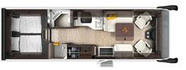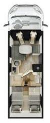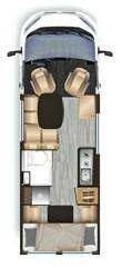 ebener Boden von Fahrerhaus bis Schlafbereich, Möbel aus Multiplex / Sperrholz, Möbel-Dekor Eiche, hellbeige Klappen mit Akzentflächen an Oberschränken, Polster Eco-Leder / bleigrau Stoff, Bodenbelag Vinyl in dunkler Fliesenoptik, 2 horizontal geteilte Oberschränke, 4 offene Ablagen Fahrerhaus, 2 im Heckbereich, 2 Oberschränke, stabile Auszüge mit Soft-Close, hochwertige Marken-Metallscharniere und Beschläge, F-Sitzgruppe mit 2 Längsbänken und drehbaren Fahrerhaussitzen, Längssitzbänke umbaubar zu 2 Einzelsitzen mit Kopfstütze und Sicherheitsgurt in Fahrtrichtung, freistehender Tisch auf zentralem Rohrfuß, absenkbar, verschiebbar, teilbar und drehbar, 2 Einzelbetten (192/197 x 80 cm) längs mit Kaltschaummatratzen auf Lattenrost, Zustieg über 2 Stufen, mit Schiebe-Lattenrost als Doppelbett (215 x 197 cm) umbaubar, dann Aufstieg mit Leiter, elektrisches Hubbett (200 x 122 cm) Lattenrost und Kaltschaummatratzen, Aufstieg eingehängte Leiter, Kleiderschrank mit Kleiderstange rechts unter EB, links unter EB Staufach mit Tür, Durchreiche zur Garage