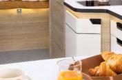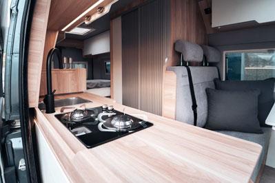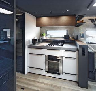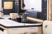 Küchenblock mit Edelstahl-Rundspüle, klappbarem Wasserhahn, Einhebelmischer, schwarz gefärbte Glasabdeckung, Dreiflamm-Gasherd mit elektrischer Zündung und schwarz gefärbter Glasabdeckung, geringe Arbeitsfläche, 2 Oberschränke mit Fachböden, Unterschrank mit 2 breiten Schubladen, 89-l-Absorber trivalent Serie, Option Dometic Slim Tower 136-l Absorber Kühlschrank im Hochschrank, 15-l-Gefrierfach