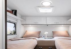 Fangen wir mit dem Hubbett des Canada TF Plus an – und das kann man kurz so zusammenfassen: Prima elektrisch zu bedienen, sehr komfortabel ausgestattet und absolut wackel- und rüttelfrei, eine sehr gute Lösung! Im Heck über der Garage glänzt der Ahorn mit großzügig dimensionierten, längs angeordneten Einzelbetten, die über zwei Stufen problemlos geentert werden können. Auch die Raumhöhe im Schlafbereich stimmt, sie wird lediglich durch die zwei Oberschränke mit Leseleuchten und USB-Steckdosen an der Rückwand ein wenig begrenzt. Praktisch ist der Stauraum in den offenen Ablagen längs über den Betten. Maße und die Ausstattung mit Lattenrosten und guten Kaltschaummatratzen sind durchweg in Ordnung. Mit einem einfachen, aber praktikabel ausziehbaren Lattenrost und zwei Zusatzmatratzen kann der Bereich zwischen den Einzelbetten geschlossen werden, es entsteht ein ebenes Doppelbett, den Aufgang zum Bett ermöglicht nun eine kleine Leiter. Die große Heckgarage bleibt auch für Fahrräder und sperrige Utensilien komplett nutzbar.