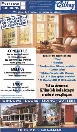 Expires 1/31/23 859-294-9395 377 E. New Circle Road, Lexington, KY A+ RATING A Whole House System Minimum 150’ Prior sales excluded. Not valid with other offers, quotes or discounts. Discounts apply to our regular pricing. Certain restrictions apply. Offers subject to change without notice. See store for details. Must be installed by our professionals. 40% OFF No need to do this when you can have this. WWW.REPLACEMENTWINDOWSLEXINGTON.COM WINTER “NO HASSLE” DEAL! • Original • Patented • No More Clogging • Protects Your Home’s Foundation 6” GUTTERS FOR THE PRICE OF 5” LIFETIME NO-CLOG GUARANTEE INTEREST FREE FINANCING AVAILABLE 859-294-9393 377 E New Circle Rd. Lexington, KY 40515 www.replacementwindowslexington.com A+ RATING 800-878-7776 Gilkey.com “You’ll love your Gilkey Windows” -Mike Gilkey, President Cannot be combined with any previous sales and quotes. Not valid with any other offers or discounts. Offer expires 10/28/12. Some minimums and restrictions may apply. Commercial sales excluded. Save $150 Window Save $300 Patio Door FALL SALE – OFFER ENDS 10/28/12 AND PER PER Many Financing Options Available! CALL FOR DETAILS! CALL FOR DETAILS! ACT NOW AND SAVE WINDOWS OF CENTRAL KENTUCKY Minimum purchase required. Prior sales excluded. Not valid with other offers, quotes or discounts. Discounts apply to our regular pricing. Certain restrictions apply. Offers subject to change without notice. See store for details. Must be installed by Gilkey professionals. Offer ends 1/31/23. 40 % OFF ALL WINDOWS & DOORS* NO MONEY DOWN. NO PAYMENTS OR INTEREST UNTIL 2024! DOORS Save on energy bills this winter with new windows and doors – and, enjoy no payments or interest until 2024! Remember last winter? GET READY NOW! WINDOWS Vinyl or Fiberglass UP TO ASK ABOUT OUR LIFETIME TRANSFERRABLE WARRANTY CALL OR CLICK FOR A FREE ESTIMATE TODAY!