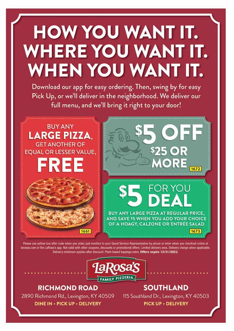 We’ve gone social! Find Family Savings Magazine on 2632 RICHMOND RD. $2 OFF OR PLATINUM GOLDWASH TO REDEEM: 1. PRESS “WASH CODE” 2. ENTER “29241” 3. SELECT PAYMENT TYPE EXPIRES 1/31/23 WITH CARNUBA (Between Chop House & Qdoba) 2632 Richmond Rd. • Lexin (Between Chop House & Qdoba) To Redeem: Step 1: Press “Wash Code” Step 3: Select Payment Type Expires 3 31 18 Step 2: Enter “48654” OR Tax extra. Valid at Lexington location, carryout only. Not valid with other coupons or special offers. Expires 1/31/23 FSM Tax extra. Valid at Lexington location, carryout only. Not valid with other coupons or special offers. Expires 1/31/23 FSM Tax extra. Valid at Lexington location only. Not valid with other coupons or special offers. Expires 1/31/23 FSM Tax extra. Valid at Lexington location only. Not valid with other coupons or special offers. Expires 1/31/23 FSM BOGO FAMILY FOUR PACK BUFFET, DRINK & $20 GAME CARD Buy One Large Pizza, Get One FREE (of equal or lesser value) 2 Adult Buffets, 2 Kids Buffets and 4 $5 Game Cards (Kids Ages 10 & Under) All ages. FREE PIZZA. GAMES. PARTIES. PIZZA. GAMES. PARTIES. $4999 $2799 $20 OR MORE CARRYOUT ORDER (Pick-up only. Delivery services not included.) $20 pre-tax. $500 OFF (Pick-up only. Delivery services not included.) ™ 2524 NICHOLASVILLE RD. | LEXINGTON | KY | 859-277-2323 | GATTITOWNLEXINGTON.COM OPEN FOR LUNCH & DINNER DINE-IN CARRYOUT & DELIVERY OPEN FOR LUNCH & DINNER DINE-IN Dine-in: unlimited pizza, pasta, salad and desserts safely served to you with tables socially distanced. Sanitized Midway games & rides! CARRYOUT & DELIVERY Mr. Gatti’s Carryout/Curbside available 859-277-2323 Delivery through GrubHub and DoorDash GET YOUR CONFIDENCE BACK. www hairinstitutelexington com B e s t H a i r R e s t o r a t i o n C l i n i c C a l l t o d a y t o s c h e d u l e y o u r F R E E c o n s u l t a t i o n ! 8 5 9 - 2 6 3 - 9 8 1 1 Hair Institute, Inc. 1795 Alysheba Way, Ste 7101 Lexington, Kentucky 40509