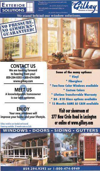 859-294-9393 377 E New Circle Rd. Lexington, KY 40505 www.replacementwindowslexington.com CLICK FOR A FREE ESTIMATE TODAY! A+ You’ll love your Gilkey Windows” -Mike Gilkey, President FALL SALE – OFFER ENDS 10/28/12 Many Financing Options Available! WINDOWS OF CENTRAL KENTUCKY 35% OFF ALL WINDOWS & DOORS* UP TO DOORS CLICK replacement windows lexington.com 2 CALL We look forward to hearing from you 859-294-9393 1 VISIT Our showroom: 377 E. New Circle Rd., Lexington, KY 3 NO PRESSURE, NO GIMMICKS! GOLD Minimum purchase required. Prior sales excluded. Not valid with other offers, quotes or discounts. Discounts apply to our regular pricing. Certain restrictions apply. Offers subject to change without notice. See store for details. Must be installed by Gilkey professionals. Offer ends 11/30/23. NO MONEY DOWN. NO PAYMENTS OR INTEREST UNTIL 2025! Vinyl or Fiberglass Thank you, Central KY, for voting us #1!