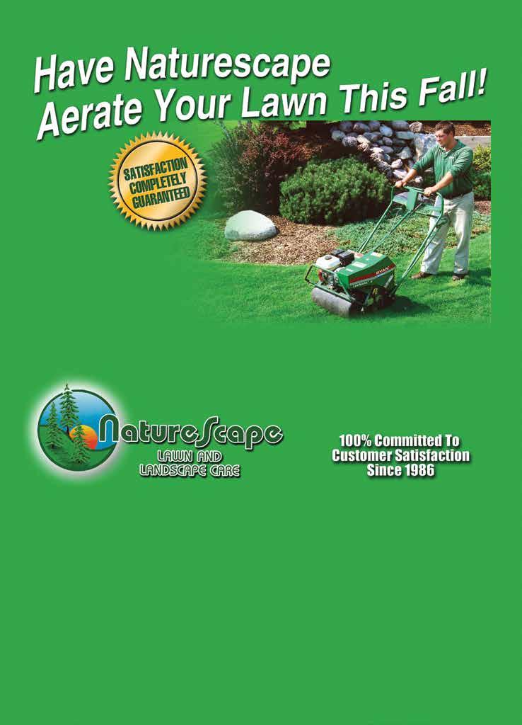 LAWN AERATION Only $89 Only $129 For Lawns 5,000 Sq Ft. and Under For Lawns 10,000 Sq. Ft and Under Here’s What Aeration Will Do For Your Lawn: • Opens soil for better penetration of air, water, and fertilizer • Decreases thatch • Prevents damage from thatch • Opens compacted soils • Promotes root growth Ask about our other Valuable Fall Services: • Fall Lawn Fer tilization with Weed Control • Tree and Shr ub Fer tilization • Extra Lawn Winter izer AERATION IS AN ESSENTIAL PRACTICE FOR A HEALTHY AND ATTRACTIVE LAWN. T H A N K Y O U ! Please Mark Your Selections My Lawn is 5,000 sq ft or under My Lawn is 10,000 sq ft or under Tax included n prices SIMPLY FILL OUT THIS FORM AND RETURN WITH PAYMENT TO THE ADDRESS BELOW OR ORDER ONLINE AT: www.naturescapelawncare.com 2025 LEESTOWN RD. SUITE S LEXINGTON, KY 40511 (859) 721-1455 Naturescape® We offer comparable discounts for lawns over 10,000 sq ft , Call for pr ices! Name Address City Zip Phone ❑ $89 Lawn Aeration ❑ $34 Fall Lawn Fertilization ❑ $39 Tree/Shrub Fertilization ❑ $144 SAVE ON ALL 3! ❑ $129 Lawn Aeration ❑ $54 Fall Lawn Fertilization ❑ $59 Tree/Shrub Fertilization ❑ $224 SAVE ON ALL 3! ® ® For more information see us at: www naturescapelawncare com Naturescape is a registered trademark of Naturescape Inc Call us for rewarding career oppor tunities! Fall ad-Lexington-Family Savings-2023_Fall ad-Reach/Indy/Greenw-2012 9/7/23 9:59 AM Page 1 FSM