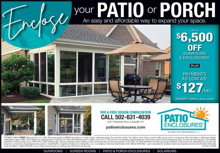 • Revitalize your outdoor space • Create an appealing, maintenance-free environment • Reduce the sun’s intense heat and block UV rays • Protect against weather’s harshest elements • Withstand high winds and snow Not valid with any other o ers or prior purchases. Must be presented at time of consultation and estimate. Call 855-412-7444 or go to BrightCovers.com $500 o any BrightCovers structure Coupon Code KFSMLEXLOU-010. Offer Expires 12.1.23