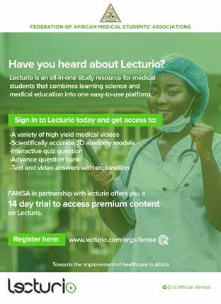 The Federation currently has a partnership with Lecturio, an online medical educa tion platform. Students under FAMSA who register with a unique link get a 14-day free access trial. 18-months worth of Lecturio access scholarships has also been awarded to winners of contests and active MSA officers. Our partnerships with other healthcare student organisations, including the International Pharmaceutical Stu dents Federation (IPSF), the International Federation of Medical Students Associa