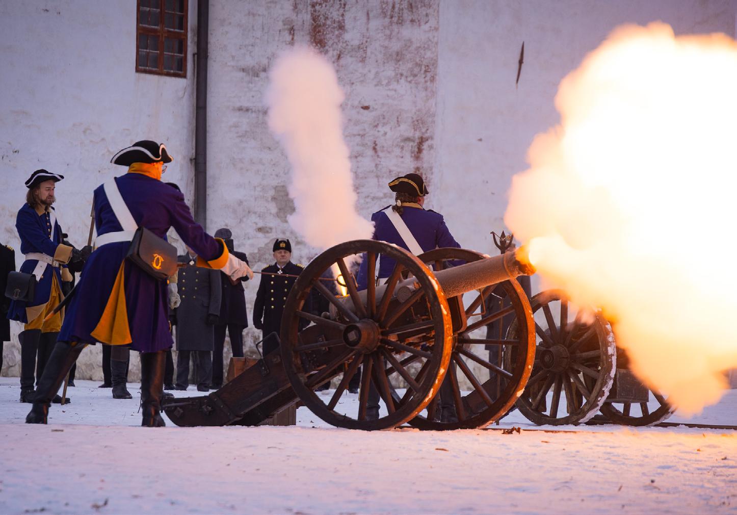 Jubileumsåret inleddes formellt med fyra salutskott, för att högtidlighålla fyra sekel, avfyrade med två kanoner av pjäsmanskap i traditionsuniformer i slottsparken i Åbo klockan nio på den riktiga dagen 16.2.2026. Bakom pjäserna befann sig Björneborgs brigads och Nylands brigads fanor med fanplutoner. Efter att Åboborna fått sin väckning kunde festpubliken förflytta sig till Kungssalen inne på slottet för att ta del av festföredrag och avnjuta kaffeservering till tonerna av Marinens musikkårs uppträdande. Gillet hade glädjen att överräcka varsitt exemplar av historiken med dedikation till Marinens stabschef amiral Huusko och det andra jubilerande truppförbandet Björneborgs brigads kommendör general Virta.