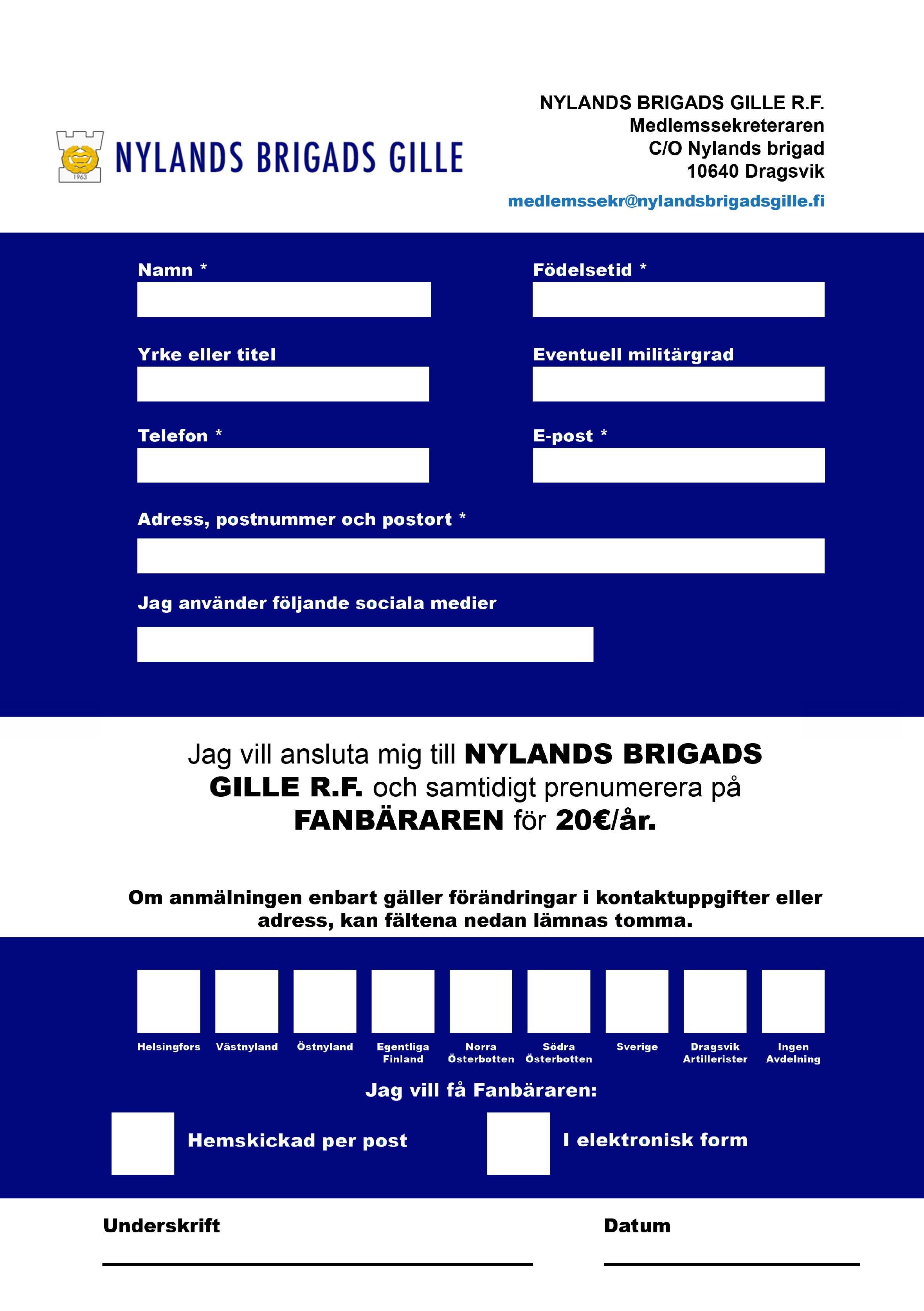 Jag vill ansluta mig till NYLANDS BRIGADS GILLE R.F. och samtidigt prenumerera på FANBÄRAREN för 30€/år, 25€ för under 30-åringar och för över 65-åringar