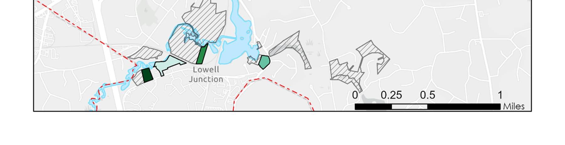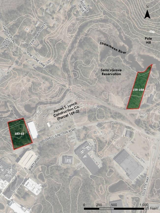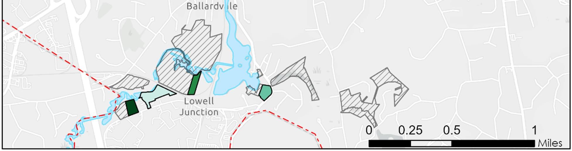 Two of the other top five prioritized parcels – parcels 183-11 and 159-10A – are located along Lowell Junction Road in the southern upstream reach of the Shawsheen River. These parcels present an opportunity to increase connectivity to existing preserved lands that abut each parcel, including the Serio’s Grove Reservation. However, another private parcel – parcel 159-2 (71 Lowell Junction Road), which is the current site of the James T. Lynch Construction Co., Inc. – stands as an important barrier to establishing greater connectivity in this area of the Shawsheen and increasing climate and flood resilience. Special consideration should be given to including this parcel in any future acquisitions of parcels 183-11 and 159-10A.