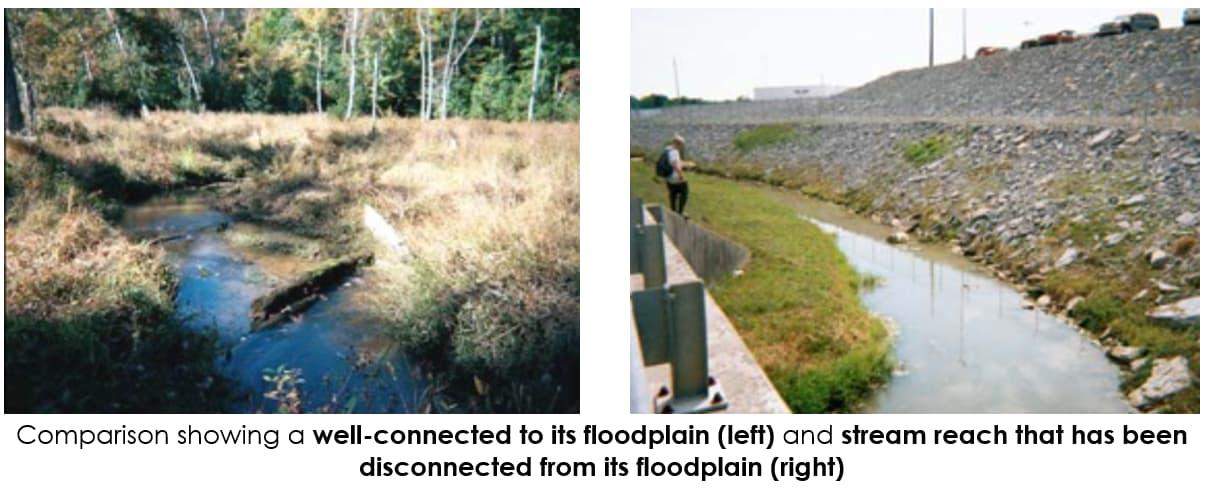 As development alters river networks, it often reduces connectivity between the river and its surrounding floodplain, which decreases flood storage capacity. Over the years, as development encroached on river banks and flooding of nearby structures became increasingly problematic, many communities, including Andover, attempted to solve flooding problems by moving water through more quickly, lining their rivers with walls or other hard armoring, or otherwise attempting to prevent water from spilling over into the floodplain. Increasing flood storage capacity by reconnecting the river to its floodplain or creating additional flood storage areas and bordering vegetated wetlands restores more natural forms of flood control. Floodplain reconnection is often accomplished through the grading of streambanks to allow water to spread out horizontally into a broad floodplain. In developed areas, this can necessitate directing where the water is allowed to spread, which can be accomplished through overflow or diversion channels that divert high flows away from the main flow path of the existing constricted channel and into a flood storage area such as a floodable park or another area that has been designed to withstand temporary inundation.
