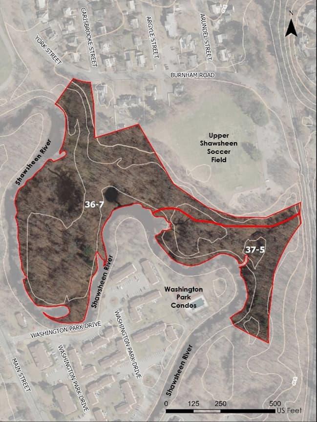 The next highest-ranked existing preserved parcels – parcels 37-5, 36-8, and 36-7 – are part of the Sacred Heart Reservation and Lower Shawsheen Field, which are under the care of the Andover Conservation Commission. These parcels are located in the area across from the Washington Park Condominiums that have historically seen some of the worst flooding impacts. These parcels scored highly because of their location in a socially vulnerable area of Andover and their community enhancement and climate resilience potential. These parcels have excellent connections to existing trails and recreation opportunities, and during the field assessments, these parcels scored well above average for flood storage and restoration potential.
