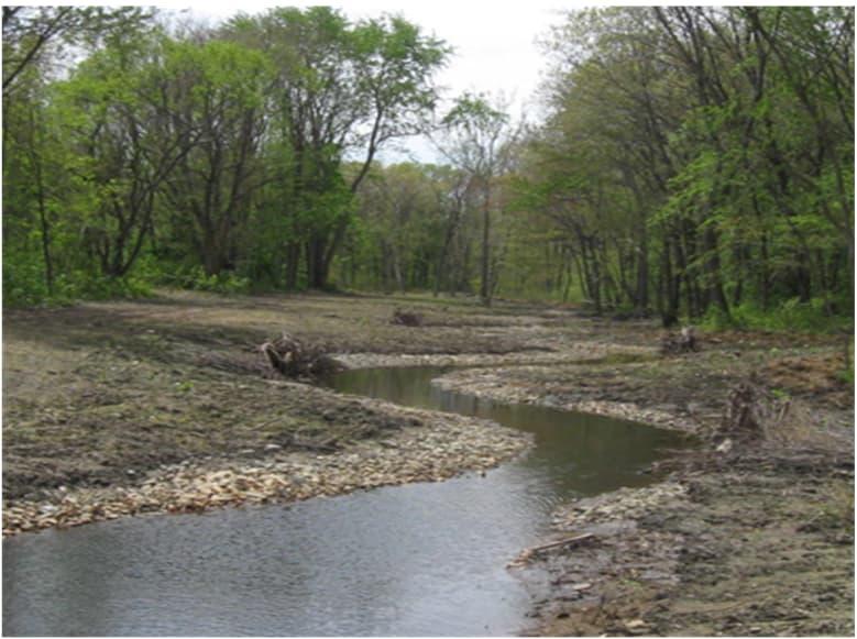 Historic approaches to river management have included straightening, culverting, and channelizing streams. Expanding the river network entails reversing this history to once again increase the complexity of a river system. Increased complexity in a river system is characterized by natural braiding or sinuosity which inherently slows stream flows, controls erosion and limits sediment transport, and helps to desynchronize flood peaks. Where space allows, restoration projects can focus on re-establishing these more natural stream and river configurations. Creation of a secondary stream channel or high flow overflow channels through existing upland can simulate the stream’s natural braiding and sinuosity. Secondary channels can also be combined with the creation of additional flood storage spaces to allow high flows to spill over into specified areas that are designed to hold and/or absorb flood waters.
