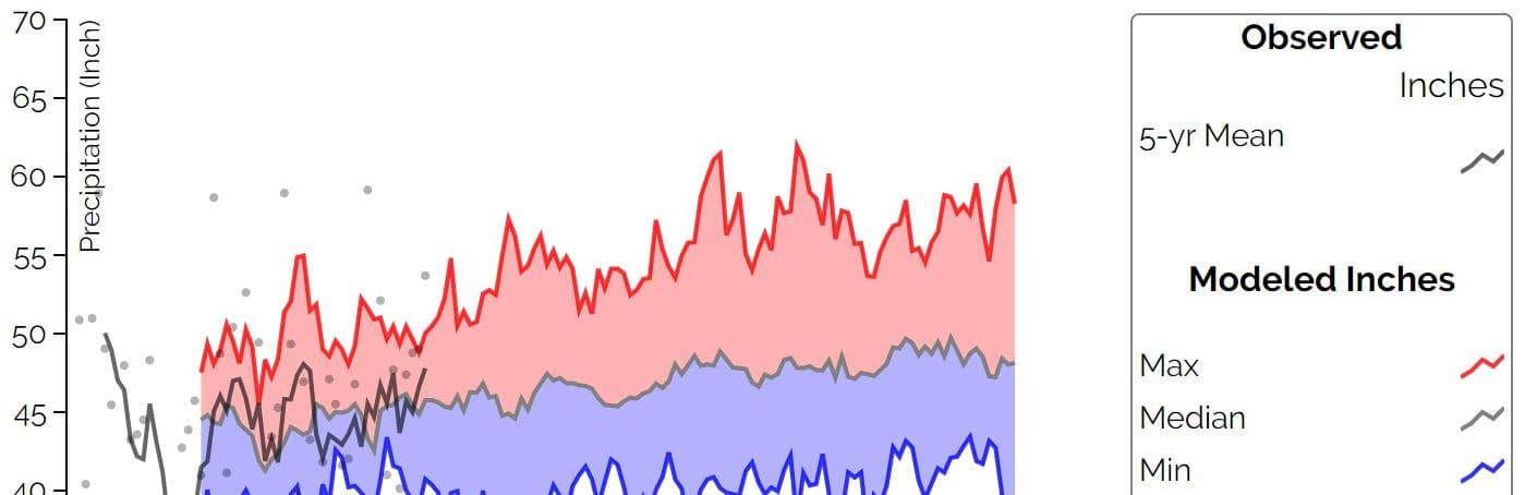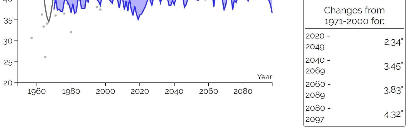 Observed and projected total annual precipitation (inches) for the Shawsheen Basin
