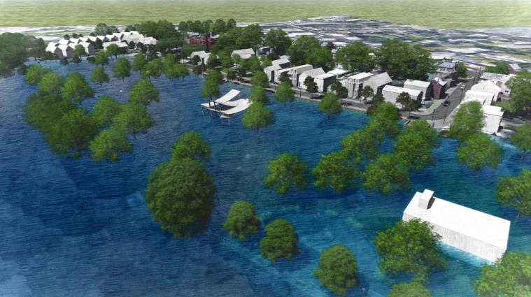 In the next phase of the project, the team identified potential neighborhood-scale and site-scale alternatives for flood risk reduction. Alternatives were developed to maximize the potential of nature-based and hybrid design approaches. And, the phasing of improvements was proposed to match several future climate risk scenarios.
