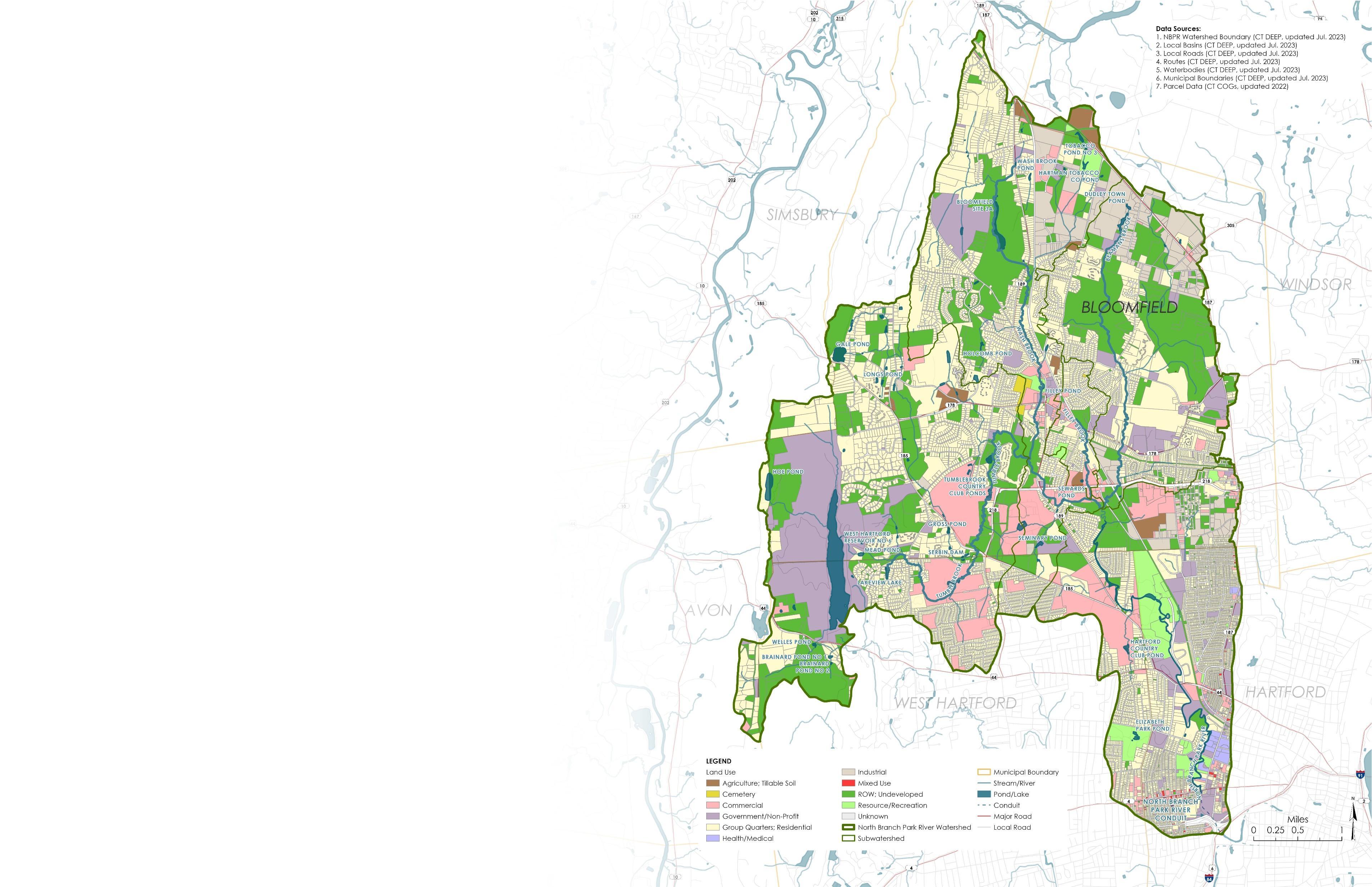 The North Branch Park River watershed is an approximately 29-square mile sub-regional basin within the larger Park River regional watershed (50 squaremile watershed) of the Connecticut River basin. Most of the watershed land area is located within Bloomfield (68%), West Hartford (17%), and Hartford (12%).