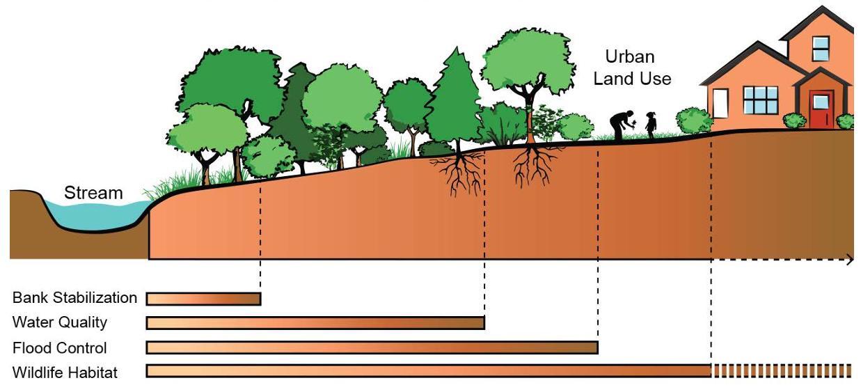 Envisioning the North Branch Park River as a healthy urban-suburban riparian corridor is rooted in Olmsted’s 1871 observation that the natural beauty of the North Branch should be protected from degradation by distancing new streets away from the river. Research has now confirmed Olmsted's observation that plant ecosystems can filter (“buffer”) stream water from roadways pollutants which can deteriorate neighborhood quality of life.