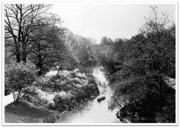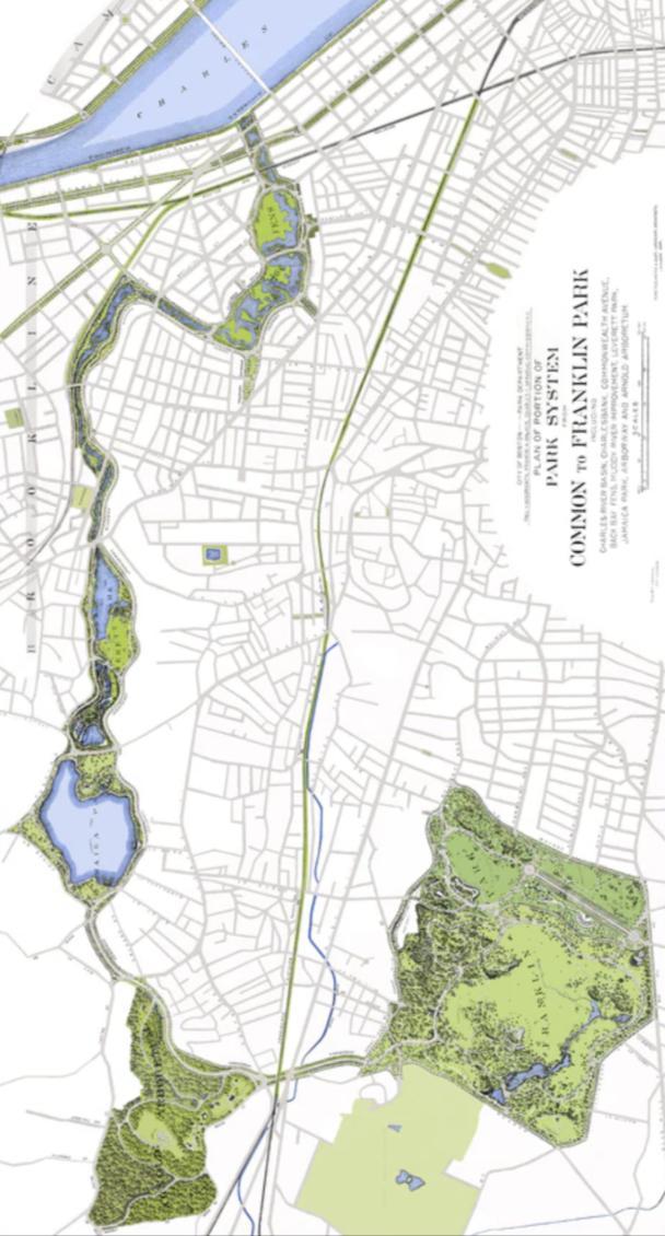 The Emerald Necklace, (left and below) is one of many examples of how conservation of urban riparian corridors can be accomplished. The sustained longevity of the Emerald Necklace's traces to F. L. Olmsted's 1874 design that transformed Boston's Muddy River by protecting the riparian corridor and connecting it to large gem parklands.