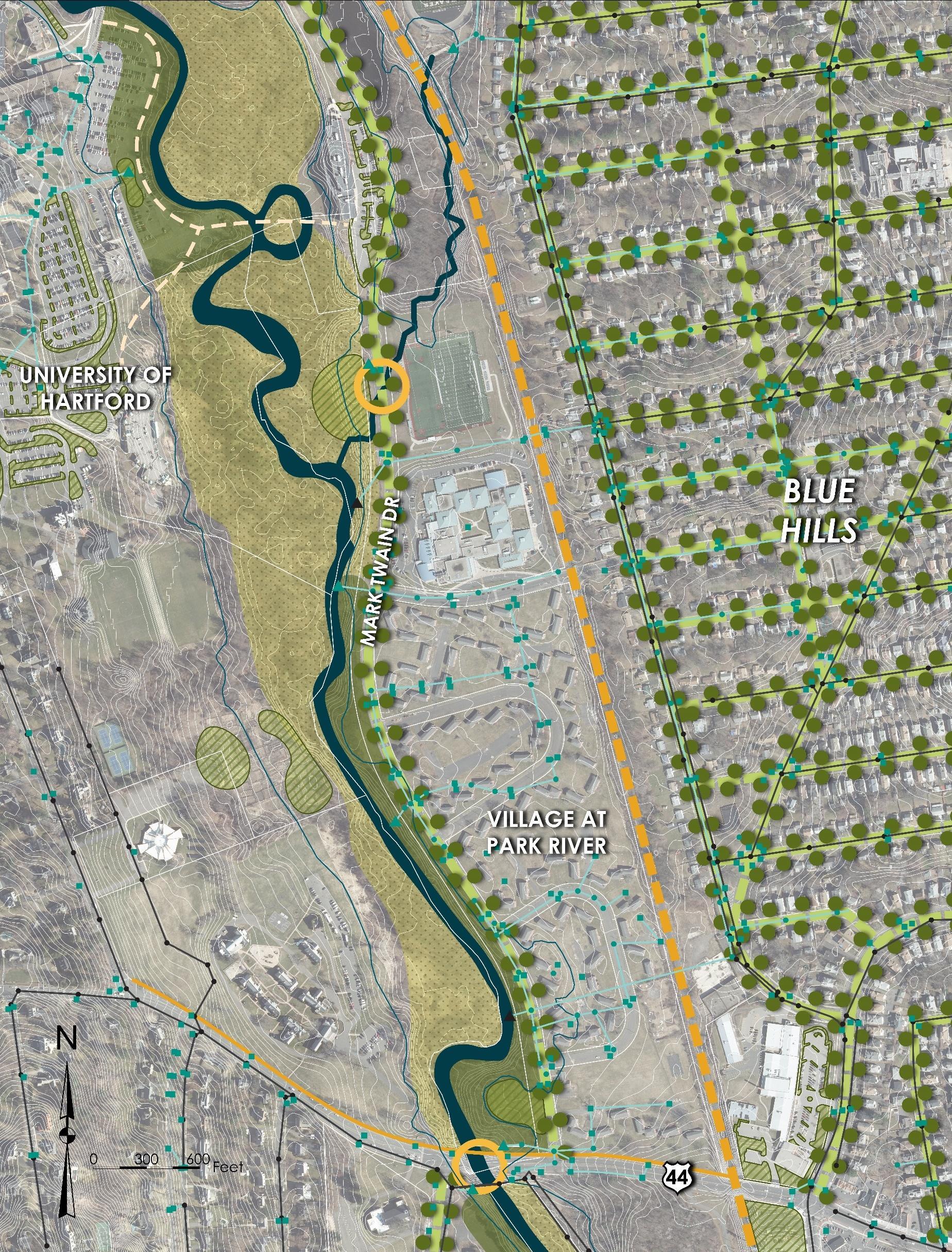 North Branch Park River riparian areas (above in green). The mainstem is formed at the convergence of Beaman's and Wash Brook south of Cottage Grove Road in Bloomfield. The North Branch flows visibly through four City of Hartford neighborhoods before entering a buried conduit at Farmington Avenue.