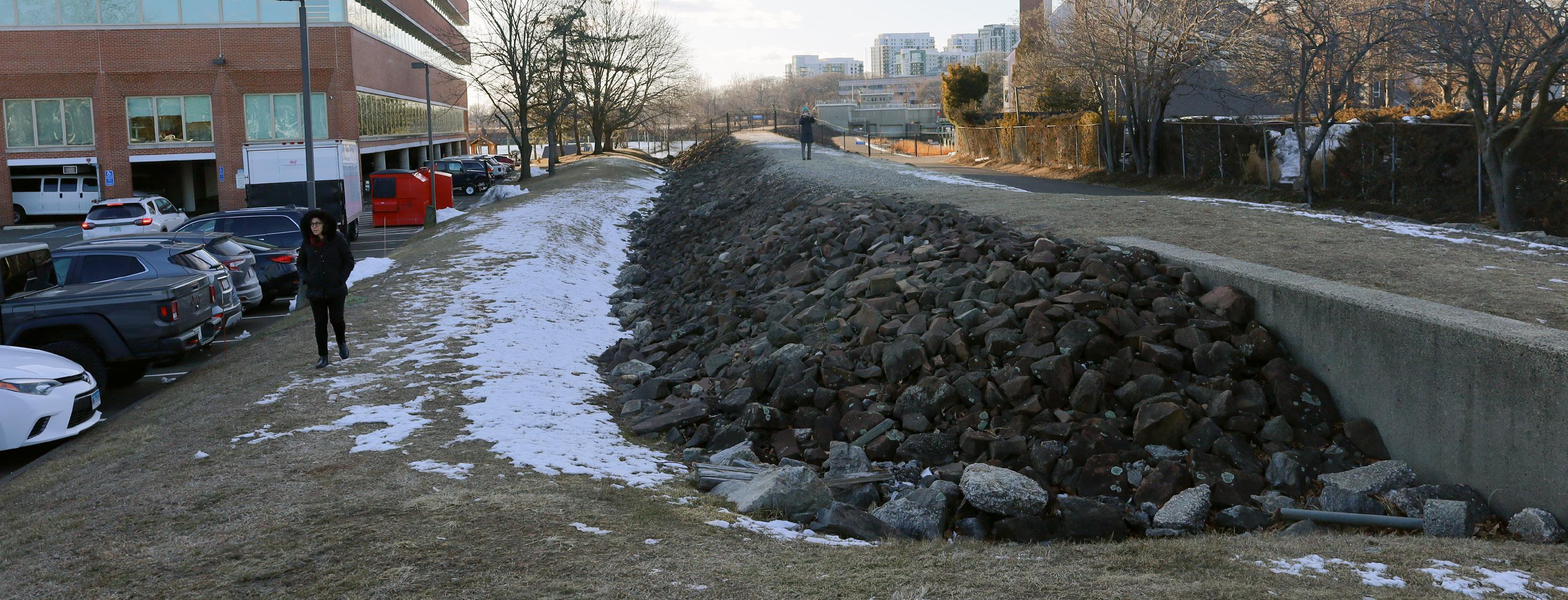 The Hurricane barrier was designed to reduce the risk from coastal flooding up to 13 69' NAVD88 stillwater elevation, plus 2' of storm surge The elevation at the top of the barrier ranges from 15 89' NAVD88 in the East and West branches, to 16 89' NAVD88 in Westcott Cove branch Source; USACE Hurricane Barriers in New England, September 2007