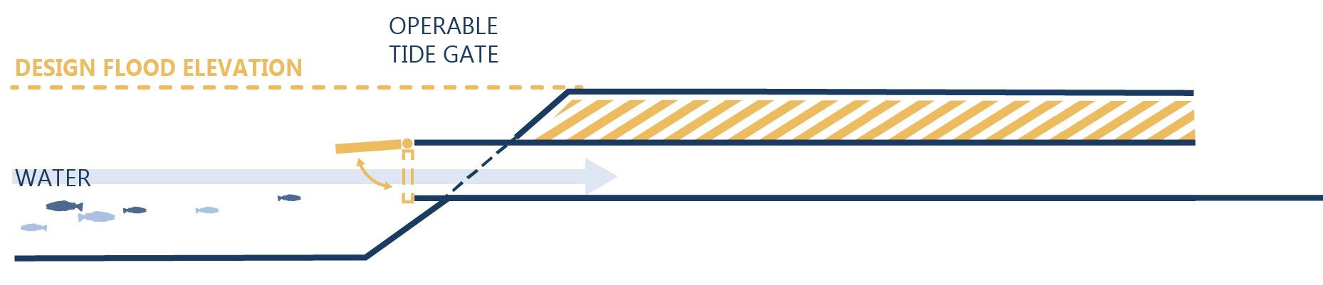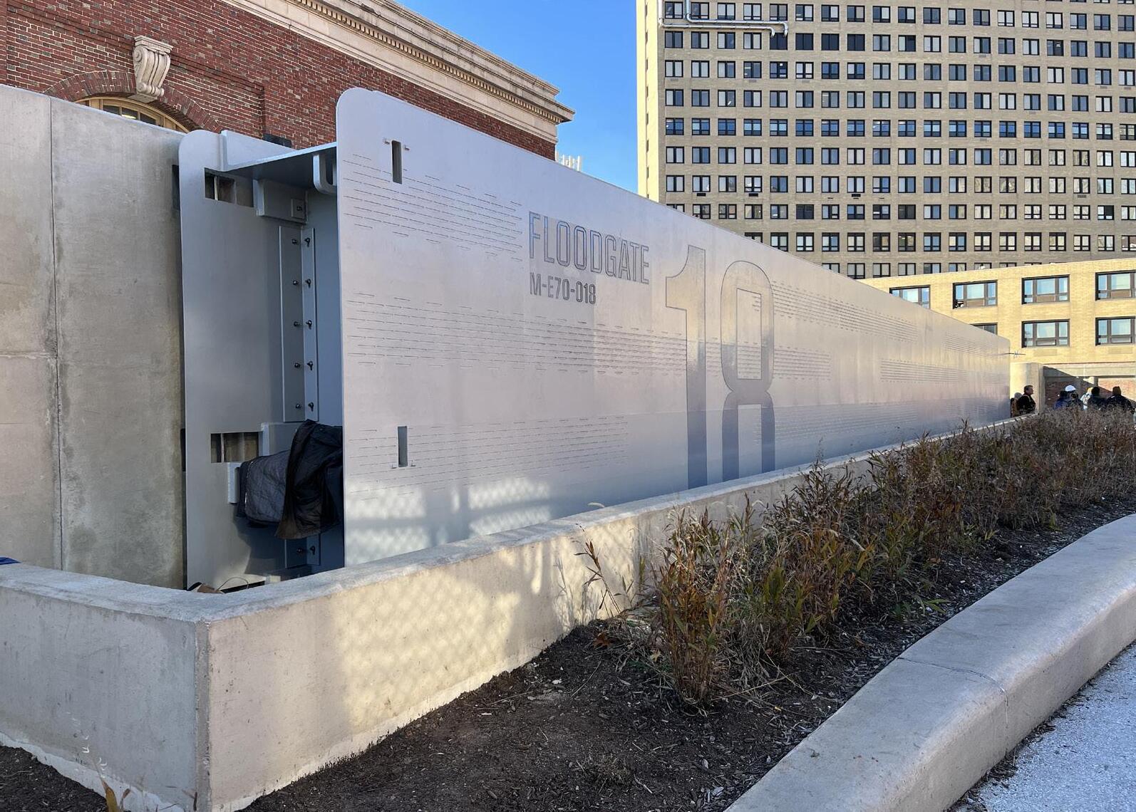 Floodwalls are structures engineered to keep water out by physically blocking floodwaters. Deployable floodgates are mobile elements, integrated into static floodwalls, that are closed during flood events to fill gaps in protective barriers and prevent floodwater intrusion. They allow access in a “Sunny Day” and prevent floodwater intrusion during storms.