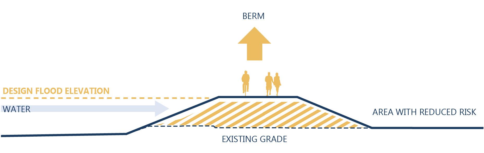 Berms and levees are raised earthen structures erected to protect from floodwater. They can support with recreational walkways and bike paths. Their natural sloped sides can be used for recreational purposes.