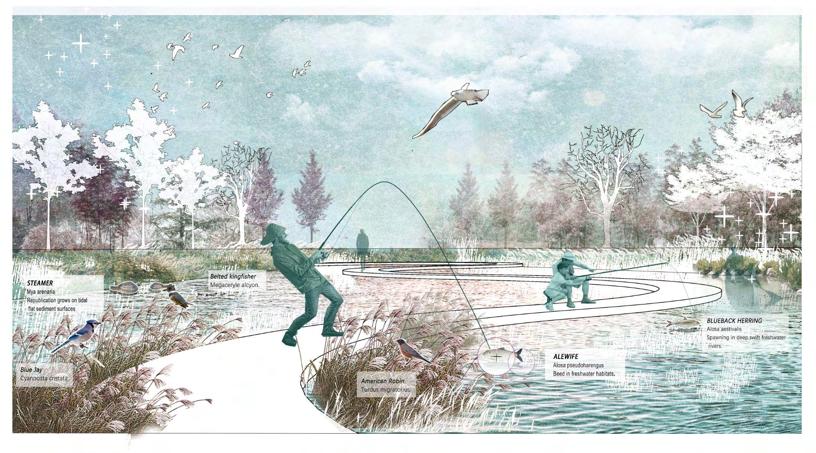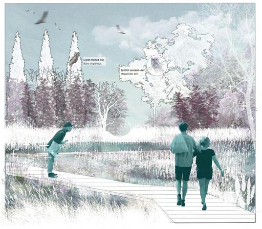 I saw a monument in the grounds, and I began to guess why it was there. I thought it might be the workers who had dedicated their lives here, and this is where they lived and worked, and under the workers, they were living individuals, and I wanted to create a happy outdoor place for the workers in this abandoned land. Encouraging the surrounding factory workers and communities to participate in this urban edge space where adults find their childhood memories, the joy to play in the nature. Thick folds made up the hills, between the space you may run, climb, or lie down. By revitalizing the site, reintegrating the site's topography, stormwater management, ecosystem, pedestrian system and activity space, to create a new ecological and social node for the landscape system along the Seekonk river and reconnect the green corridor. It will enable people to escape from the busy work life for a while, and to relax in the green space during their leisure time.