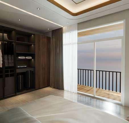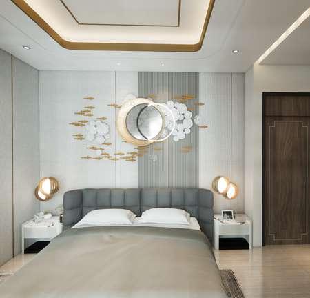 Perancangan desain interior pada kamar tidur utama yang memiliki konsep desain minimalist modern dengan minimalisasi ornamen untuk menciptakan ruang yang luas dan rapi, Penambahan sentuhan elegan dan mewah terdapat padaaksen material permukaan glossy dan gold yang diaplikasikan pada elemen tertentu memiliki aksen reflektif yang lebih lembut dan suasana ruangan yang hangat.
