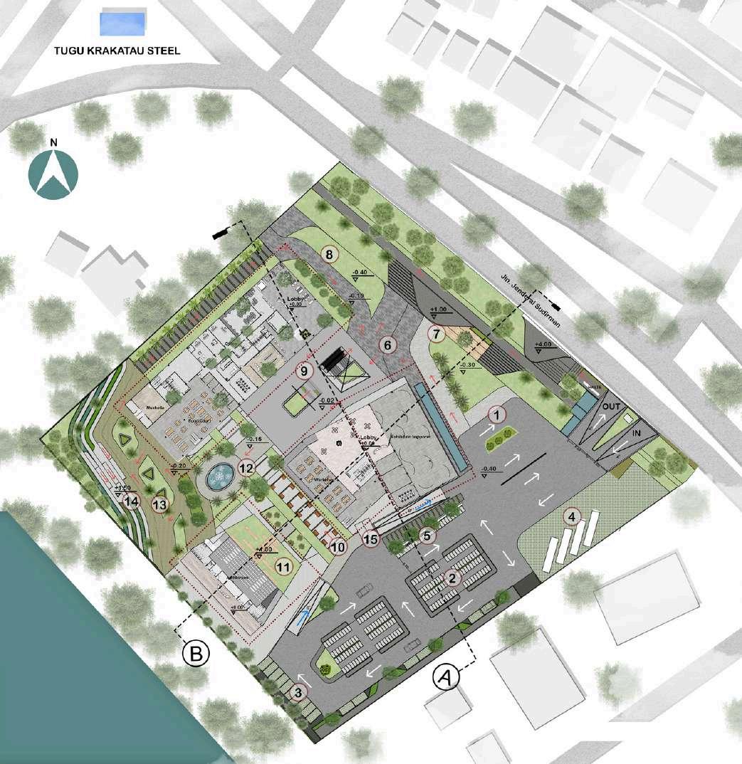 Konsep tapak pada perancangan ini terdapat ruang terbuka hijau yang dapatdigunakan sebagai tempat peristirahatan, beraktivitas, bersosialisasi dan bersosialisasi secara komunal bagi kolektif dan komunitas. Selain itu, perhatian desain terhadap kondisi iklim di sekitar yang panas dan berpolusi. Area lanskap kanopi solar sebagai tempat peristirahatan, beraktivitas, bersosialisasi dan bersosialisasi secara komunal bagi kolektif dan komunitas.