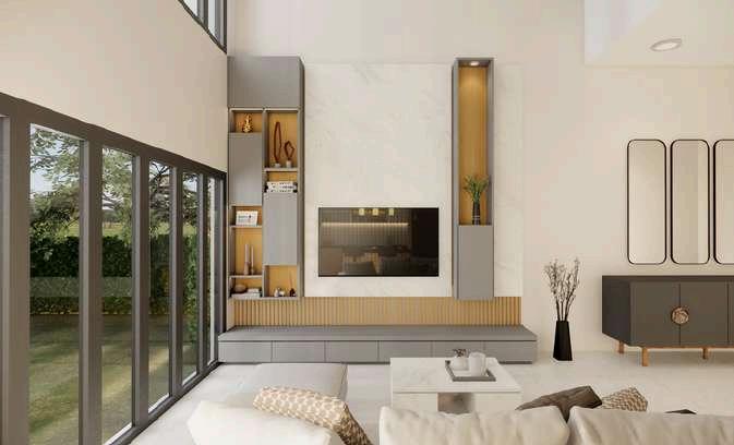 Material dominan kayu sebagai aksen alami yang membawa nuansa hangat dan organik ke dalam ruang. Kombinasi warna netral untuk menciptakan sentuhan elegan dan mewah terdapat aksen material permukaan glossy dan gold yang diaplikasikan pada elemen tertentu memiliki aksen reflektif yang lebih lembut dan suasana ruangan yang hangat.