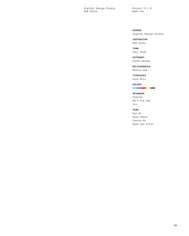 COURSE Digital Design Studio INSTRUCTOR Bob Slote TERM Fall 2016 CATEGORY UI/UX Design DELIVERABLES Mobile App TYPEFACES Dock Nº11 COLORS KEYWORDS Digital 80’s Hip Hop Fun TEAM Ran An Dana Isken Fannie Ko Dana Van Etten