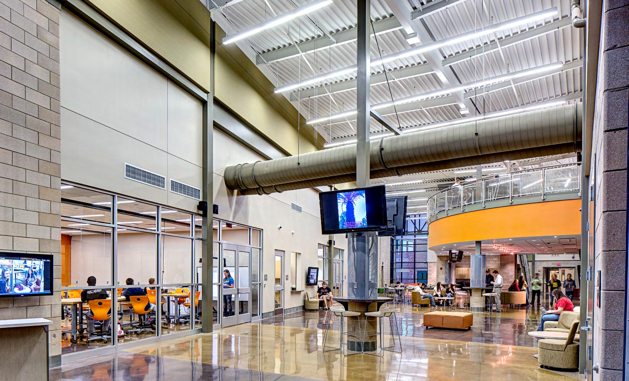 At the terminus of Scholar Street is a two-story Innovation Center which represents the central tenets of the Center for Innovation and Digital Learning: exploration, collaboration and critical thinking. The Innovation Center includes a research commons, technology exploration labs, a television studio and science demonstration labs that double as makerspaces. The dramatic building includes a large amount of glass curtainwall, providing Tyrone Middle School with a striking new identity within the community.