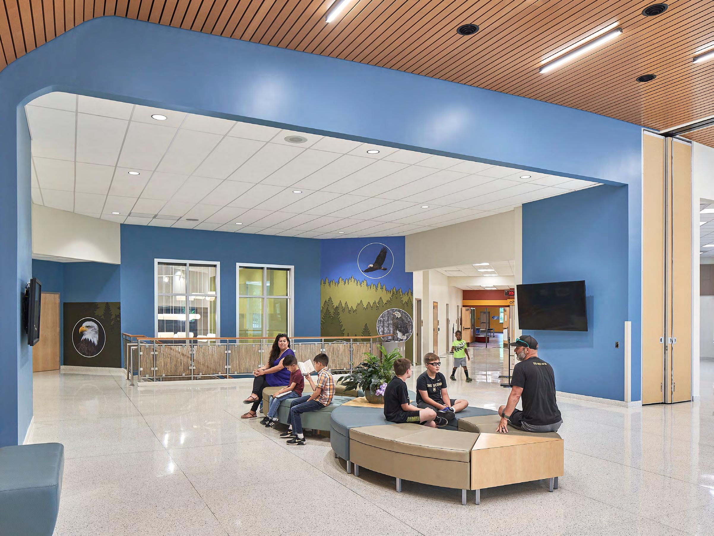 This replacement elementary school features learning studios arranged around collaboration hubs. The facility contains almost no fixed casework, allowing teachers to quickly arrange and rearrange the environment to support various learning and teaching styles. Futureready concepts of flexibility and security ensure the school will stay relevant and innovative for generations to come.