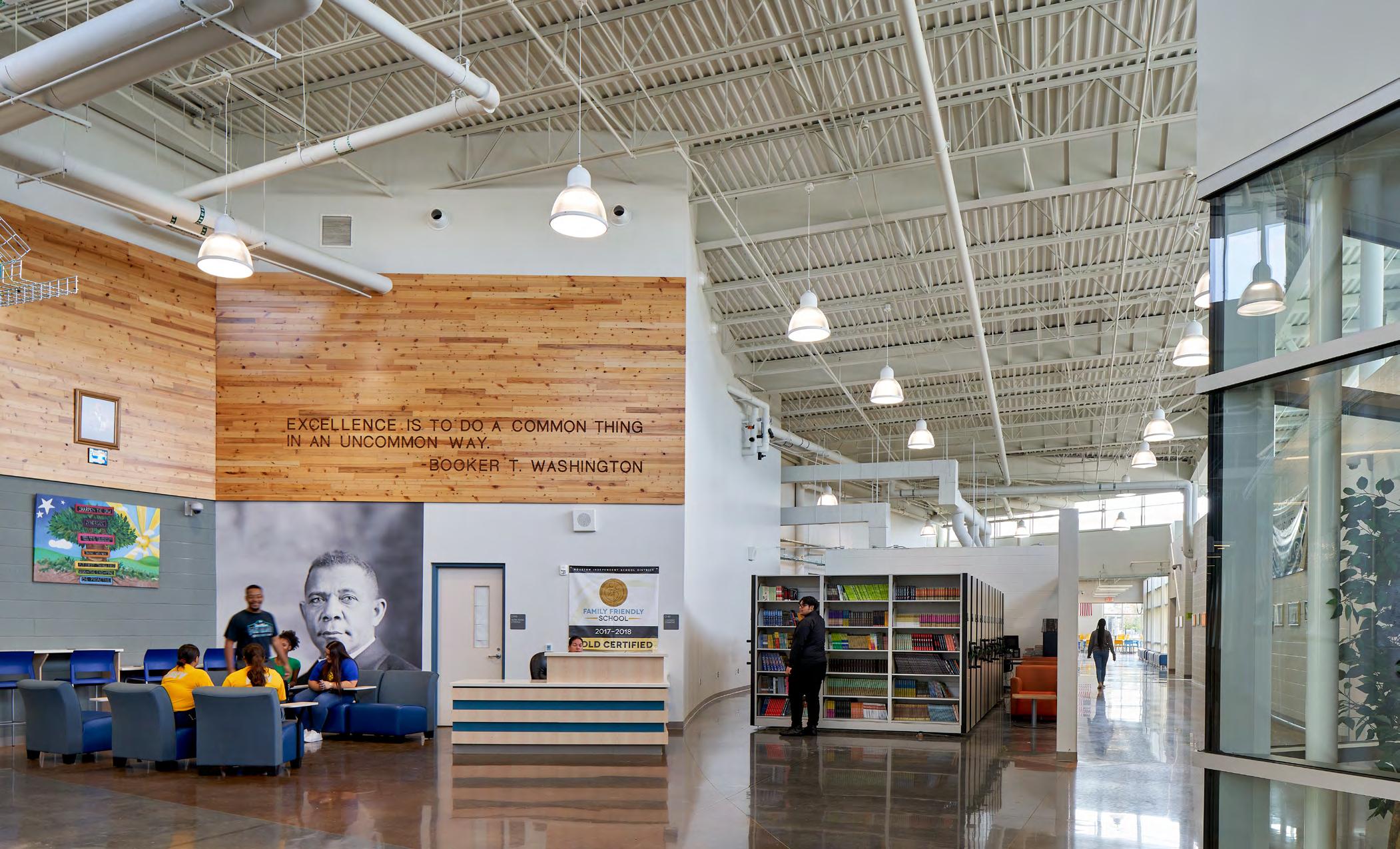 Established in 1893, Booker T. Washington High School for Engineering Professions has a long history of changing to meet the times. The design of the new replacement high school marks the next chapter in this story. In the new school, science and engineering laboratories blend into each academic neighborhood, allowing for the integration of engineering, science and technology, as well as general studies. Cross-disciplinary environments make for a collaborative learning experience that builds future-ready skills. Transparency supports the school's integrated approach to learning, allowing students to be inspired by the activities of their peers.