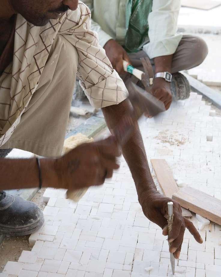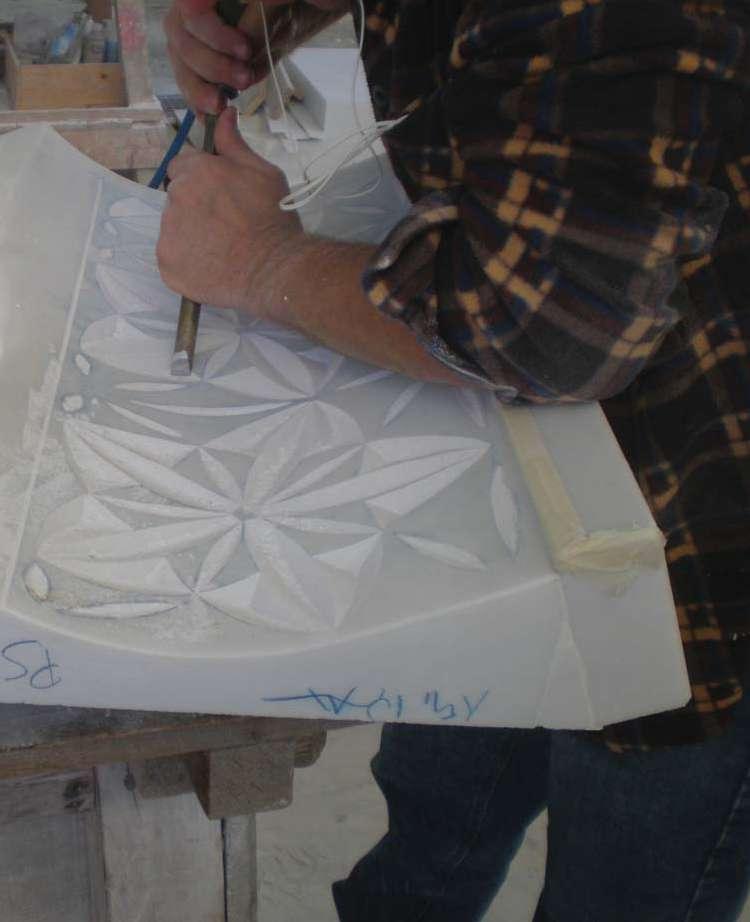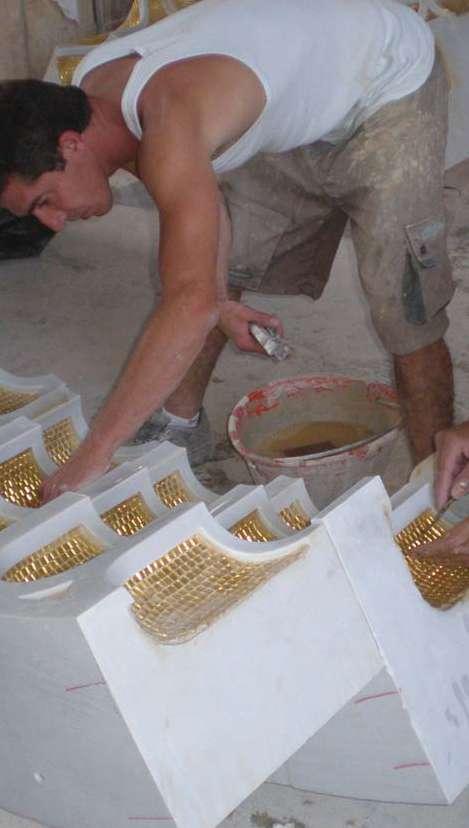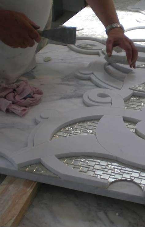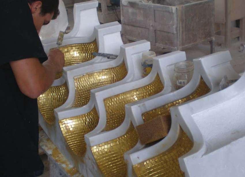 lavorazioni pannello in marmo con intarsio di mosaico in oro bianco. chiselling phase of the marble panels with white gold mosaic inlay.