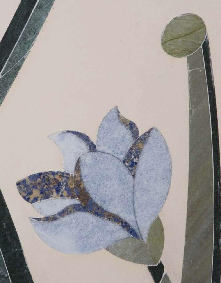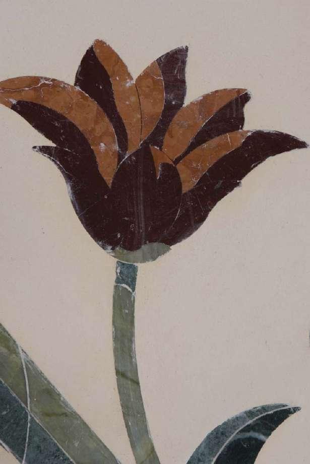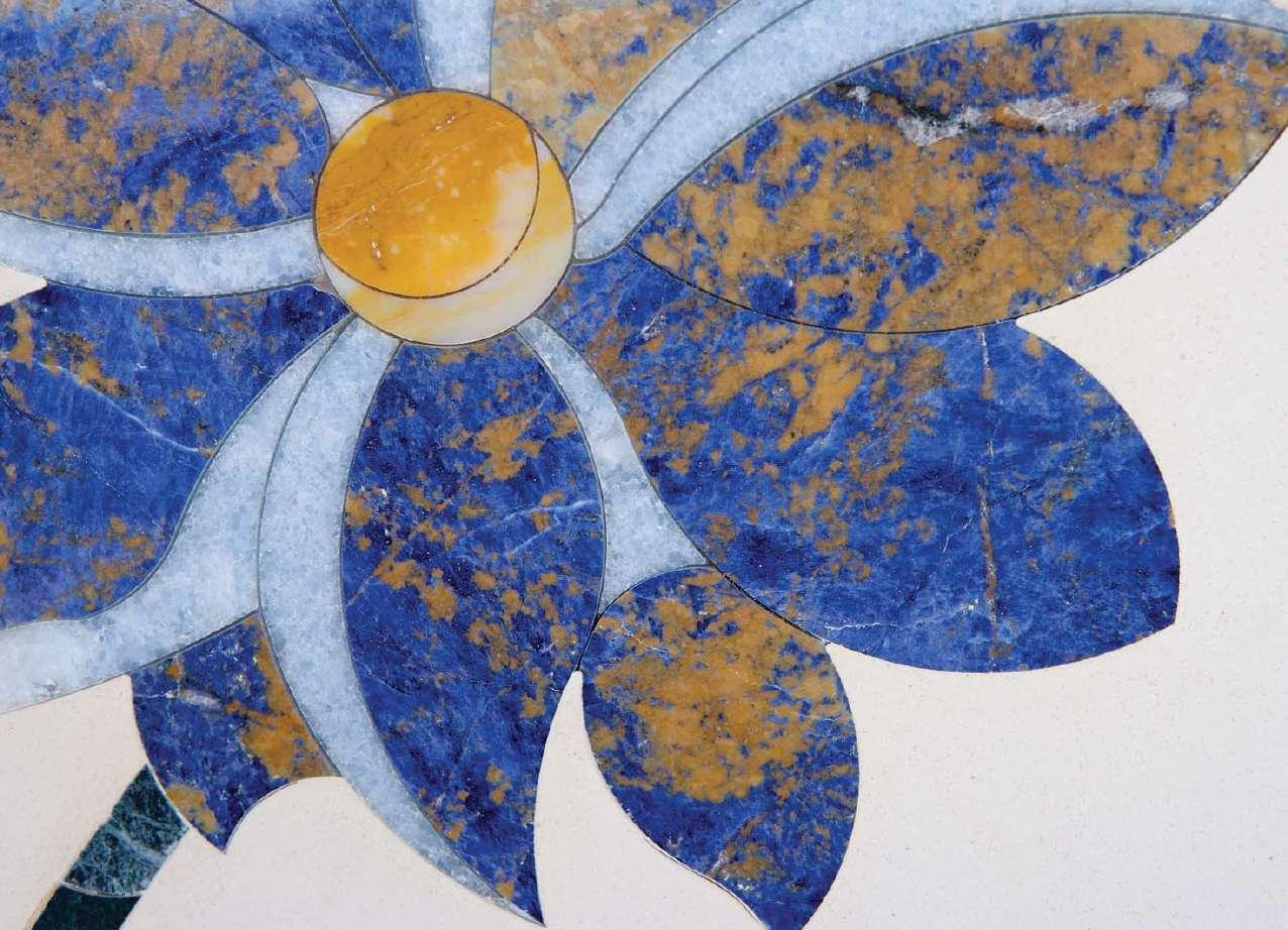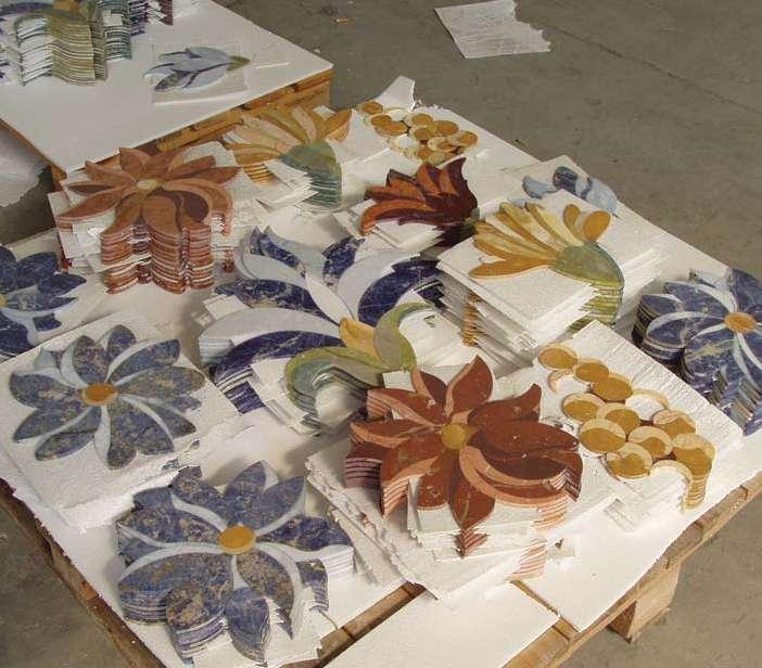 intarsi floreali realizzati in pietre preziose e marmi tagliati a water-jet in fase di assemblaggio. flower inlay, in precious stones and marble cut by water-jet, ready for assembling.
