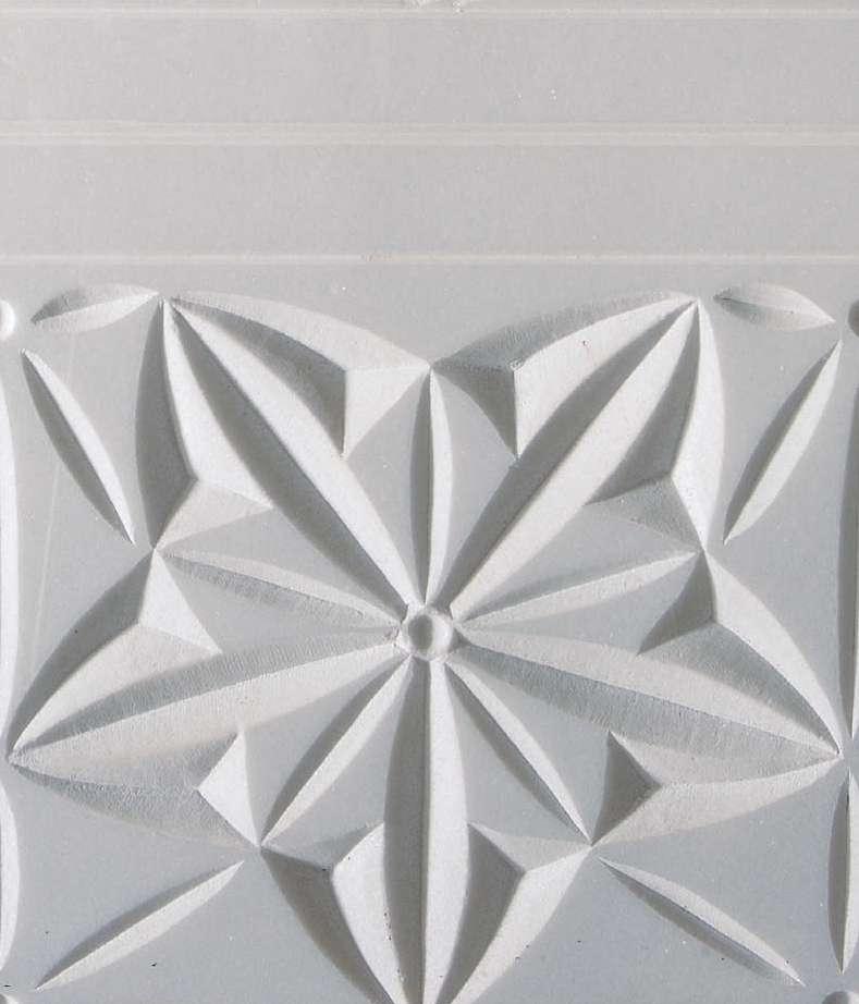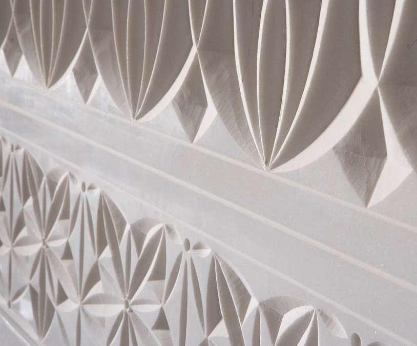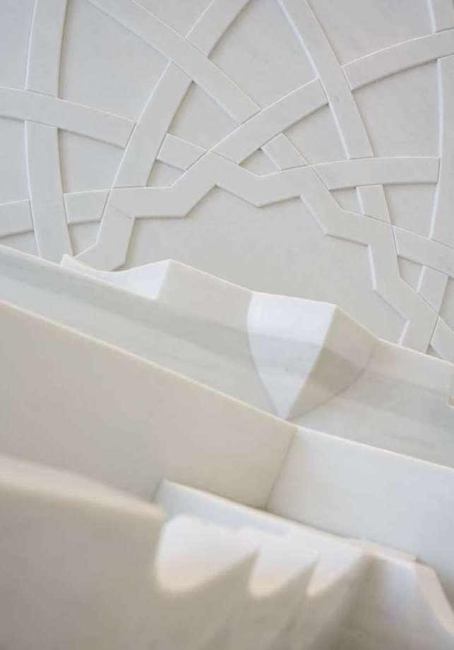 Islamic architecture developed a rich catalogue of columns and architraves carved in stone and stucco relief work, featuring geometric or floral motifs. The decorative features used in the portal frame zone, taking up the entire front and depth of the openings, present a sequence of pentagonal stars which alternate with a pattern of solids and voids. The design provides an evolving process almost breathing life to the theme of emerging buds and shoots. The architectural elements that grace and embellish the portals is the work of skilled hands, that carved these borders of Bianco Lasa marble.