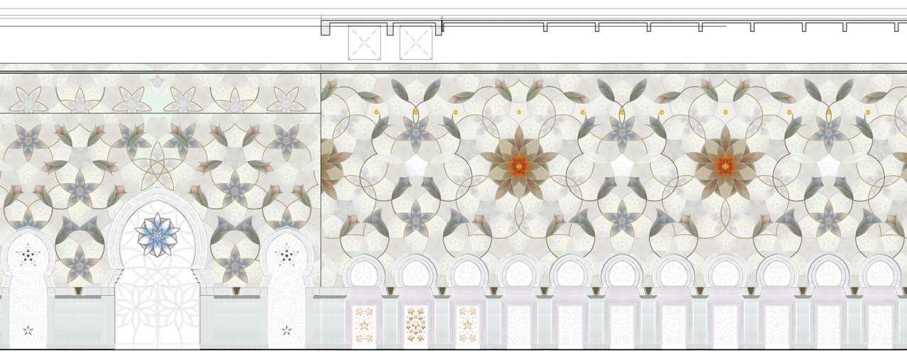 particolare della parete est, la grande sala della preghiera. detail of the interior east wall elevation, main prayer hall.