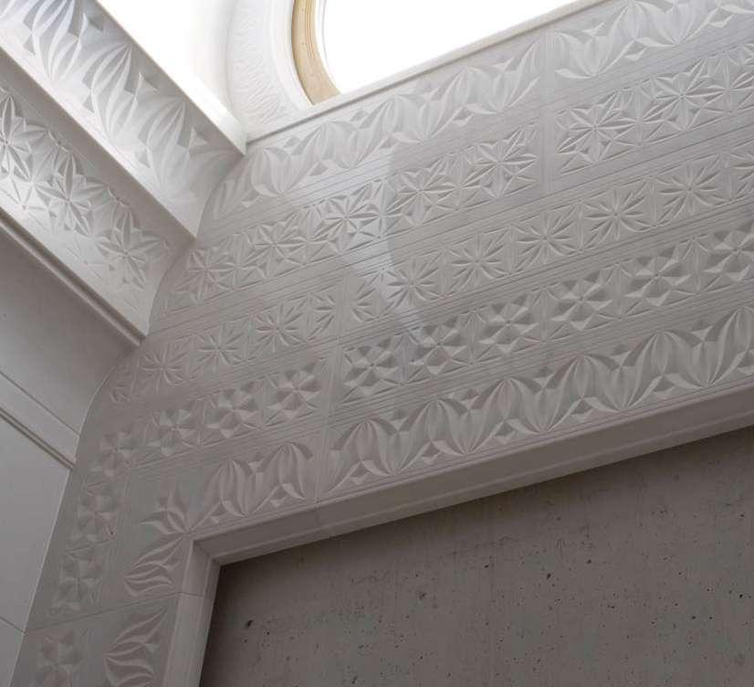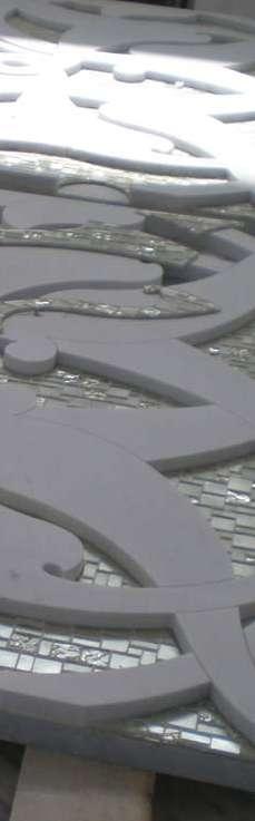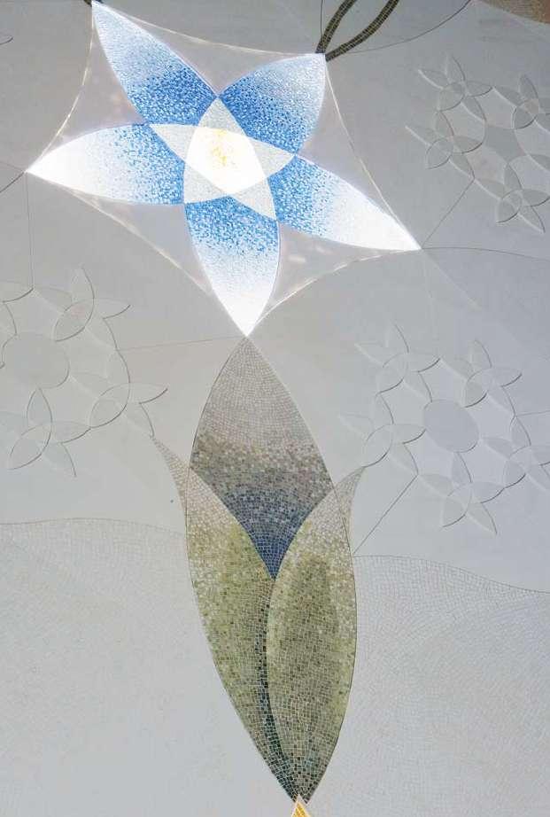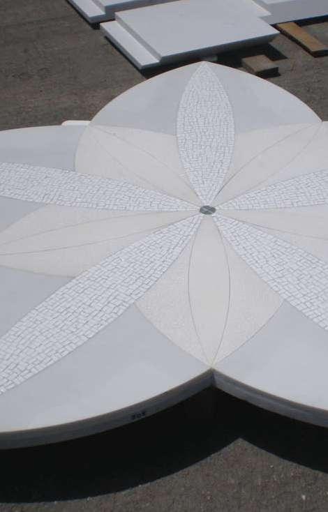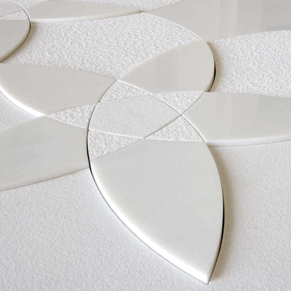 details of one of the panels made in white marble pre assembled, polished, bush hammered and sandblasted with enamel mosaic inlay.