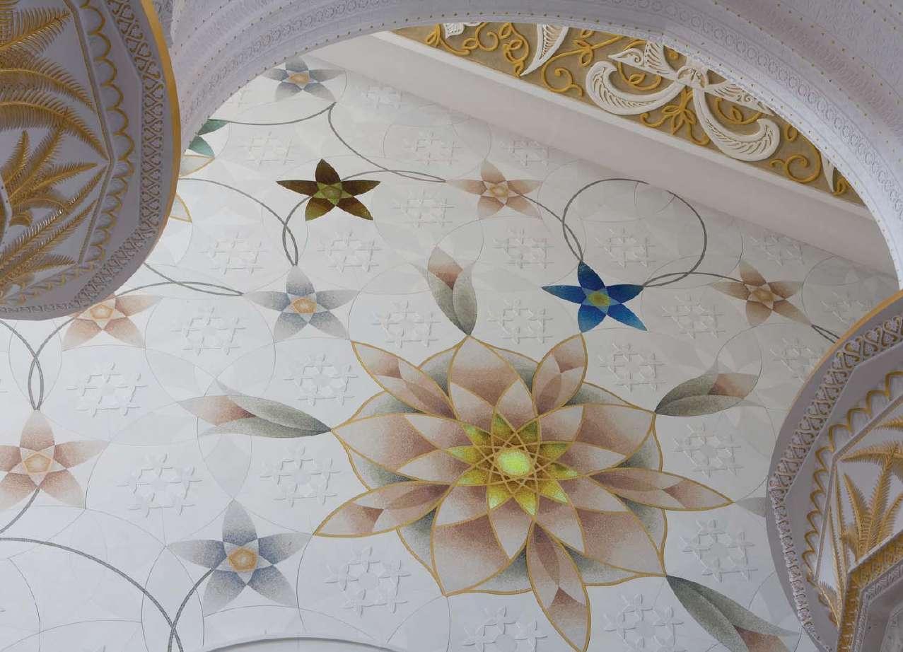 In 2004 the Office of HH Shaikh Sultan Bin Zayed Al Nahyan, Chairman of The Works Department, Abu Dhabi (United Arab Emirates) invited Fantini Mosaici to work on a project, the scope of which presented considerable challenge for the company, to date. Fantini Mosaici decided to proceed, taking into consideration the design specifications, Client’s aspirations and complex project requirements. HH Shaikh Sultan was led and inspired by his father’s vision for building the Grand Mosque.