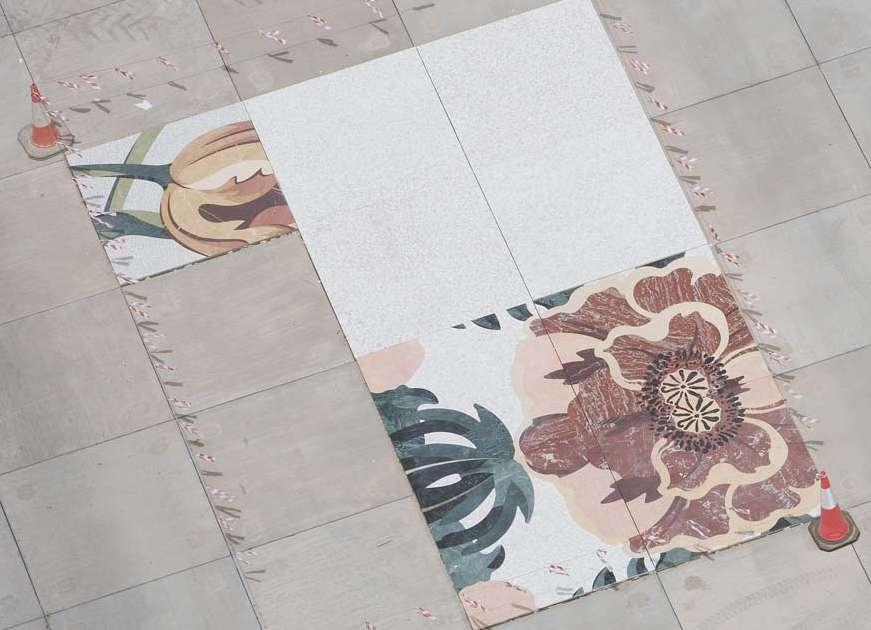 L’artista britannico Kevin Dean ha progettato e presentato lo schema concettuale per il cortile sulla base delle indicazioni del cliente, che parlavano di un “pavimento a fiori nel cortile”. Fantini Mosaici ha lavorato, insieme all’artista, sul progetto, e preparato i dettagliati disegni costruttivi. Occupando una superficie di 17.500 mq riempita da mosaici in marmo liscio, il complesso intarsio floreale in marmo è tagliato a water-jet.
