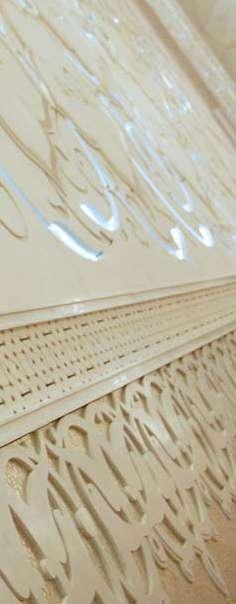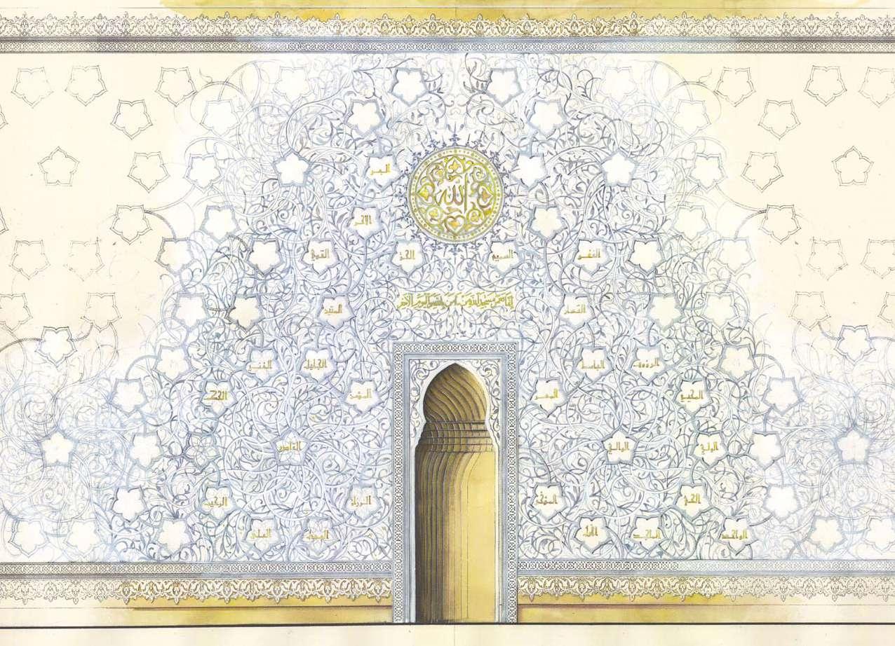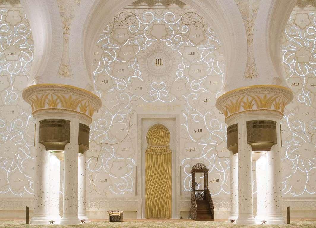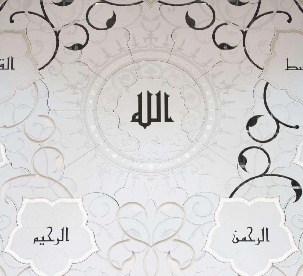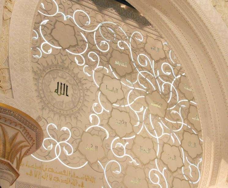 The wall extending along the Qiblah was designed in two lateral parts each 50 meters long, with an additional central wall section of 35 meters. The wall pattern here reflects that of the facing wall, without emphasis on chromatic colours used in the latter, in order not to deflect concentration during prayer. The central section forms an open page: with the 99 Names of Allah. In the centre of the wall is the Mihrab, with inlaid gold mosaic. The entire Qiblah wall is dressed in pierced panels of marble “Bianco P”, articulated with an intricate inlay of white gold mosaic and illuminated from the back. The void and transparency provided by the wall, lightens the structure and accentuates the metaphor of the passage in the direction to Makkah.