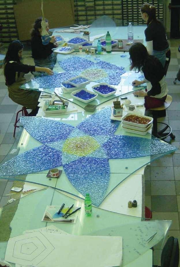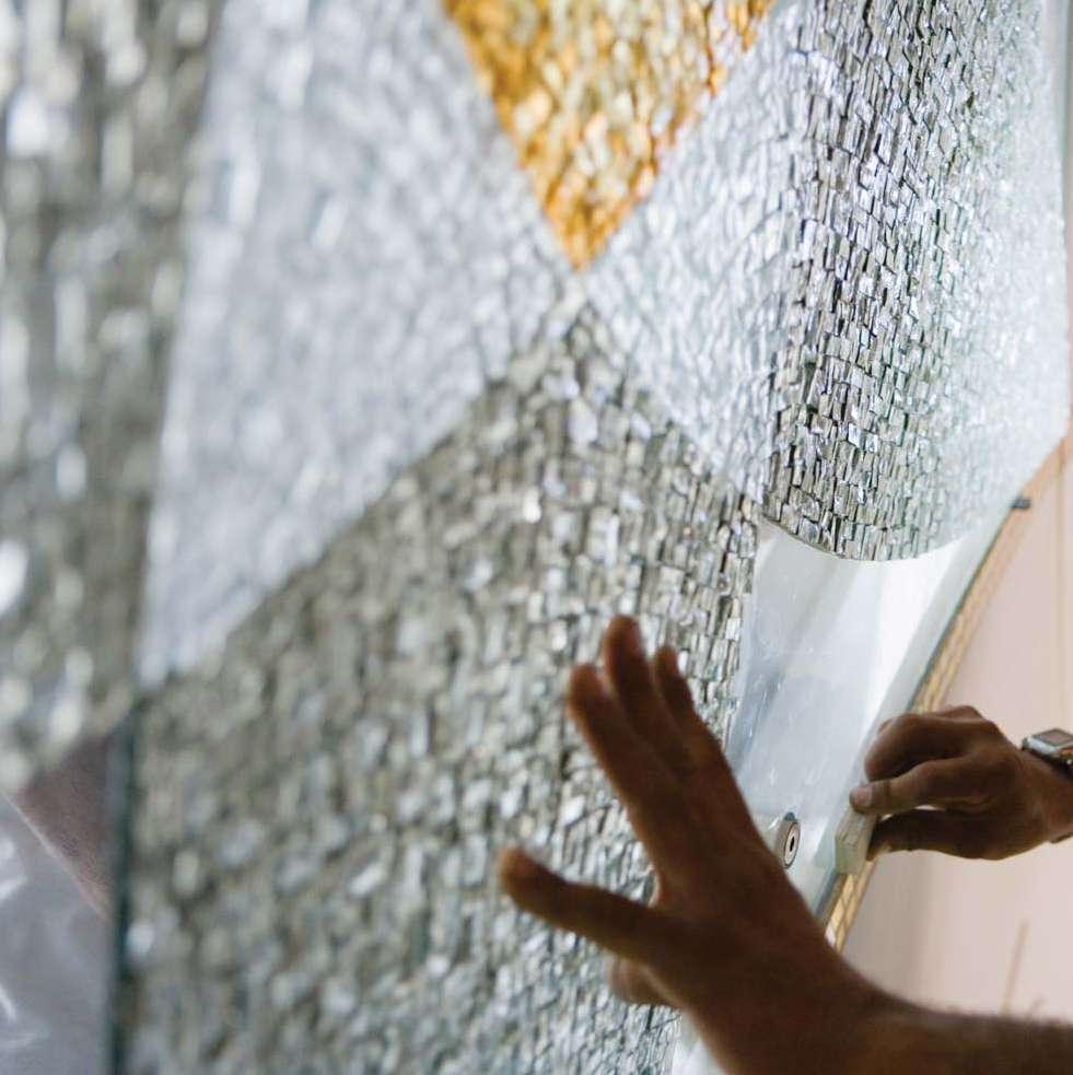 fasi di lavorazione del mosaico di vetro trasparente nell laboratorio in italia. manufacturing the glass mosaic panels at the workshop in italy.